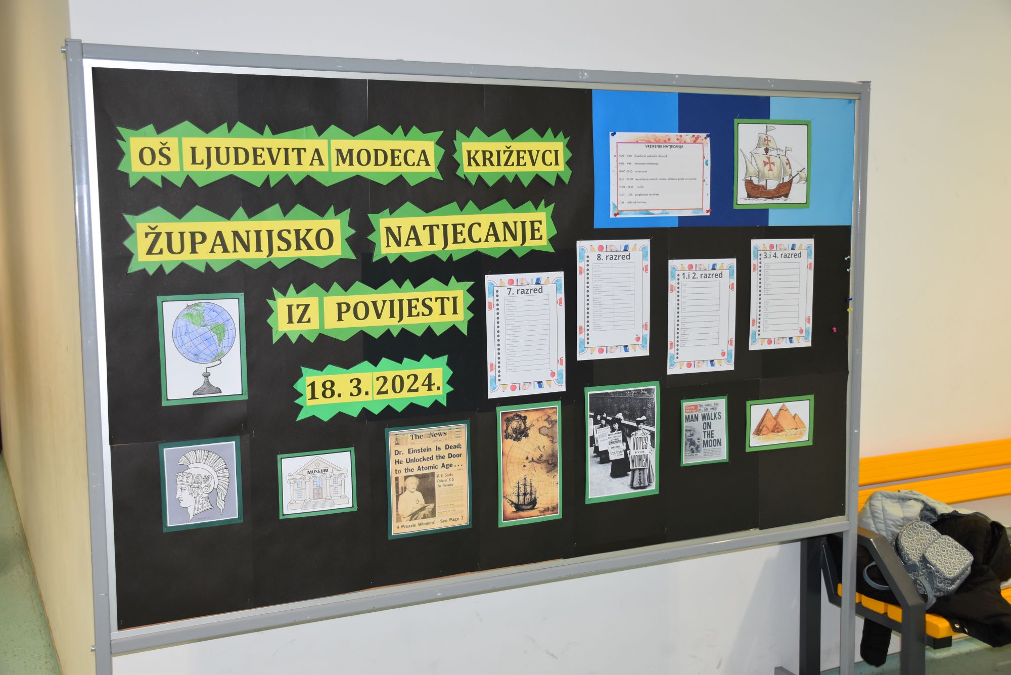 Osnovna škola Ljudevita Modeca bila je danas domaćin još jednom županijskom natjecanju, ovaj put iz povijesti. Natjecalo se pedeset učenika sedmih i osmih razreda osnovnih škola i srednjoškolci iz cijele županije, a ravnatelj Tomislav Bogdanović poželio im je sreću te da poput Herodota, oca povijesti, uživaju u traganju za novim znanjima i sklapanju novih prijateljstava. Od križevačkih učenika u kategoriji sedmih razreda drugo mjesto osvojila je Klara Rađa iz OŠ “Vladimir Nazor”, četvrti je Luka Novosel Glavočević, peta Tena Budja i dvanaesta Ana Šarić, dok se od osmih razreda na drugo mjesto plasirao Bartol Krnjak, svi iz OŠ Ljudevita Modeca.