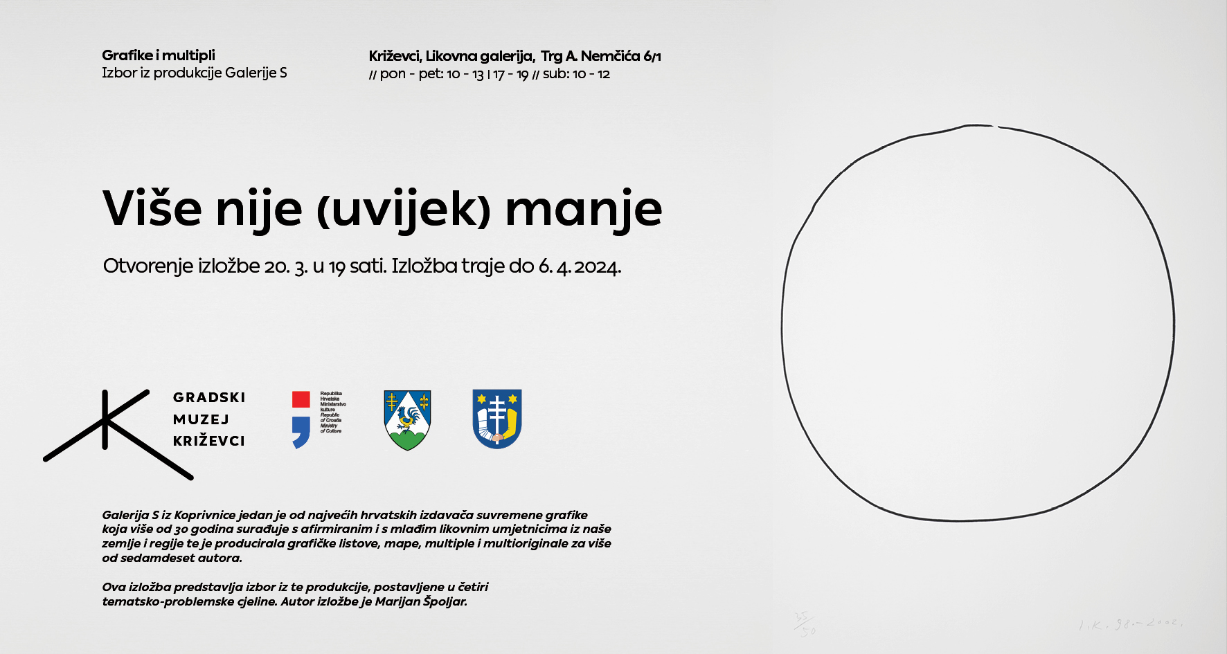 U Likovnoj galeriji Gradskog muzeja na Trgu Antuna Nemčića večeras, u srijedu 20. ožujka u 19 sati, otvara se izložba Više nije (uvijek) manje. Riječ je o izboru iz produkcije Galerije S iz Koprivnice koja više od 30 godina izdaje suvremene grafike, grafičke listove, mape, multiple i multioriginale afirmiranih i mlađih likovnih umjetnika iz naše zemlje i regije. Autor izložbe je Marijan Špoljar, a podijeljena je u četiri tematsko-problemske cjeline od kojih je jedna posvećena akademiku Ivanu Kožariću.