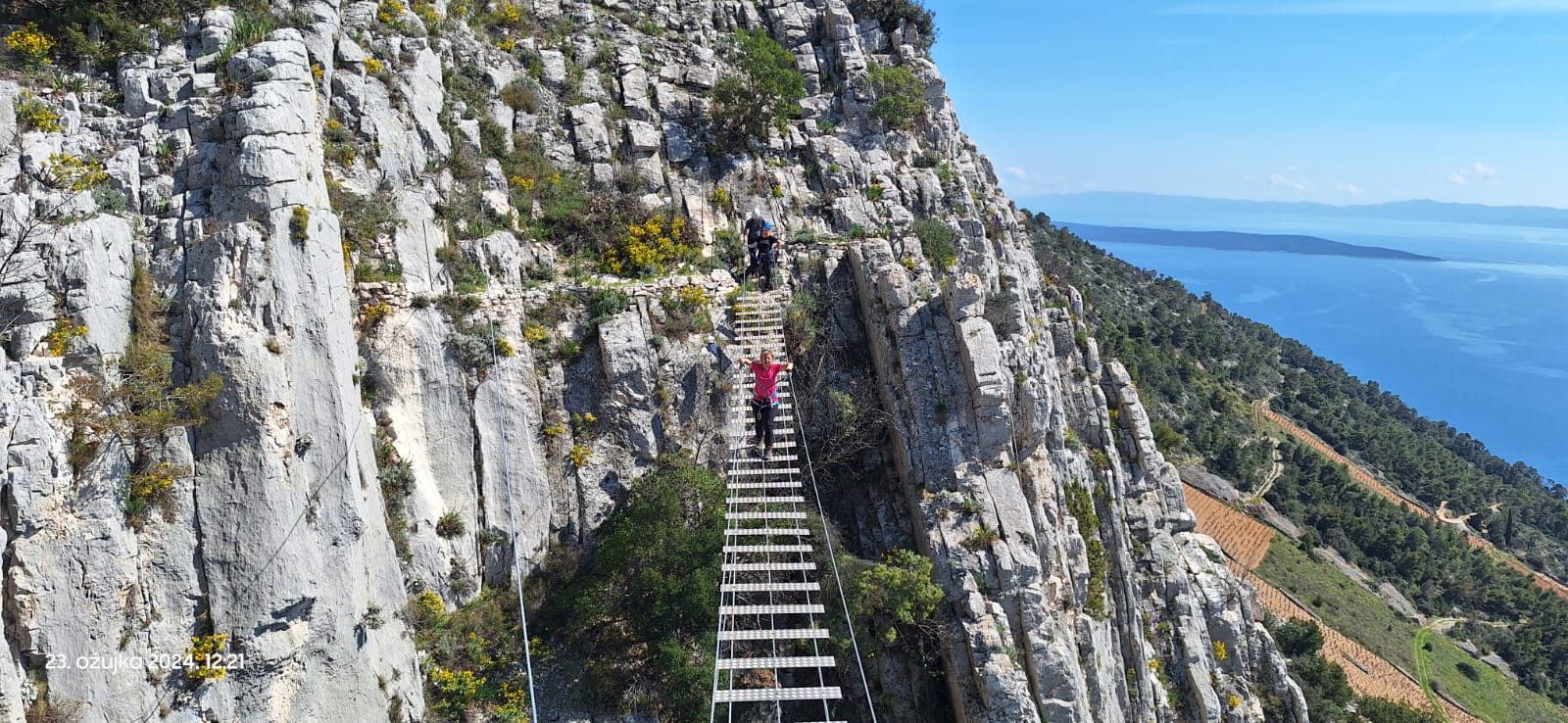 Planinarsku stazu izabrao je veći dio ekipe, dok se njih dvadeset dvoje jakog srca i čvrstog želuca odvažilo na uspon feratom, preko malih uskih stuba uklesanih u stijenu i metalnog mosta koji se ljulja visoko nad naseljem. Iako za penjanje feratama nije potrebno prethodno iskustvo, osim obavezne opreme treba imati i hrabrosti. Ova hvarska je ukupno duga 250 m, no baš taj viseći most ni iskusne alpiniste ne ostavlja ravnodušnima. “Prolazak mostom nije bio obavezan, on je kao adrenalinska atrakcija jer s njegove druge strane staza ne vodi dalje. No naši planinari su se odvažili i isprobali ga, i to dvaput jer su se istim putem morali i vratiti. Dobra je to vježba za suočavanje sa strahom od visine, pogotovo za one koji dosad nisu prošli puno ferata“, rekao nam je planinar Zlatko Mustić.