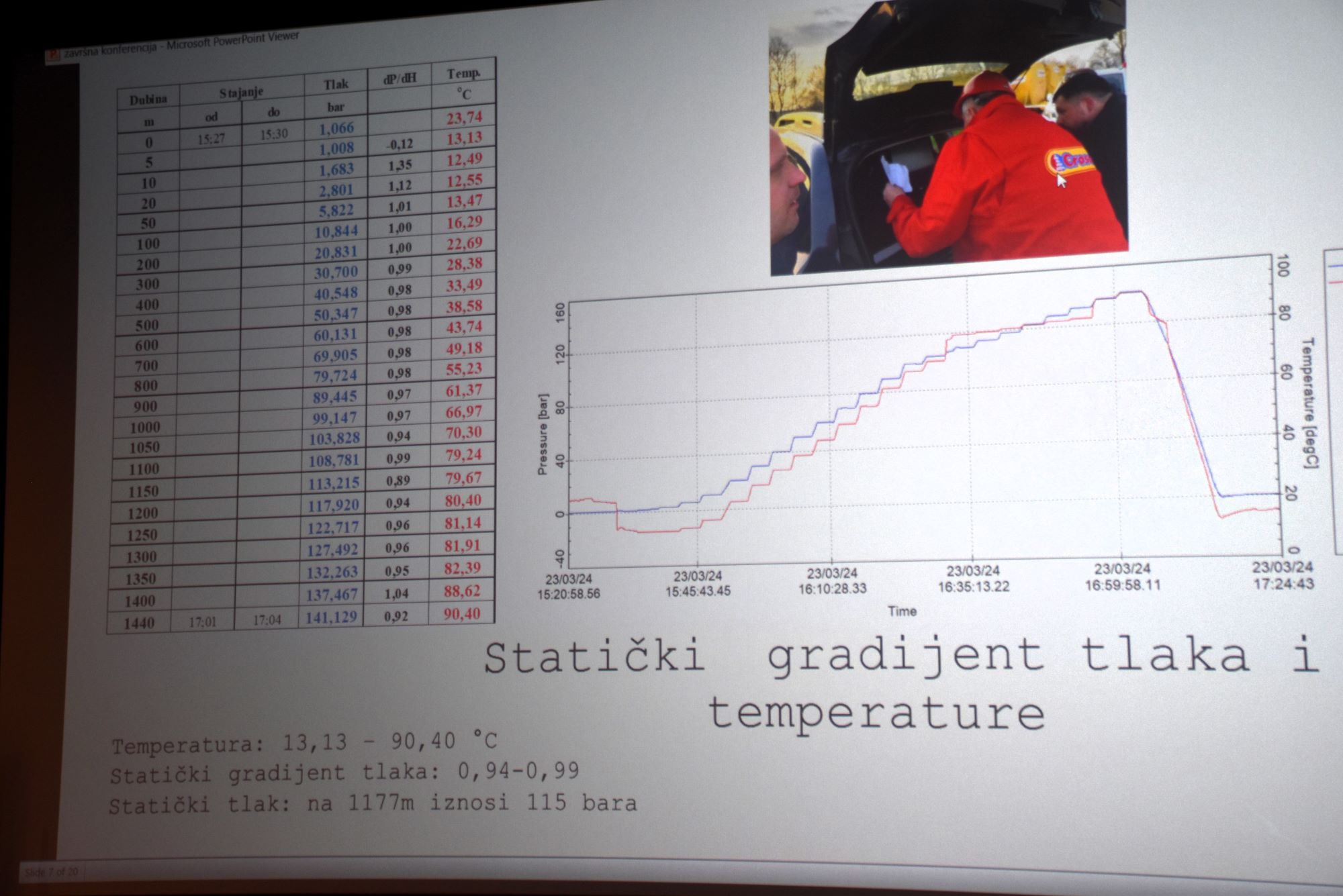 Prema rezultatima ispitivanja buštine Križevčanka-1, koje se u sklopu dva projekta provodilo od svibnja 2022. s ciljem dobivanja parametara za izračun rezervi geotermalne vode, temperatura vode na ušću je skoro 80 °C, a na razini ležišta je iznosila 90.4 °C, rečeno je danas na završnoj konferenciji za oba projekta. Postojeća bušotina istraživana je dva dana u ožujku na dubinama od 300 i 500 metara, a dobiveni podaci koristit će se za utvrđivanje rezervi i energetske snage bušotine. Radi li se o ležištu s prirodnim napajanjem u kojem tlak tijekom crpljenja neće padati, tek se mora utvrditi praćenjem parametara tijekom eksploatacije.