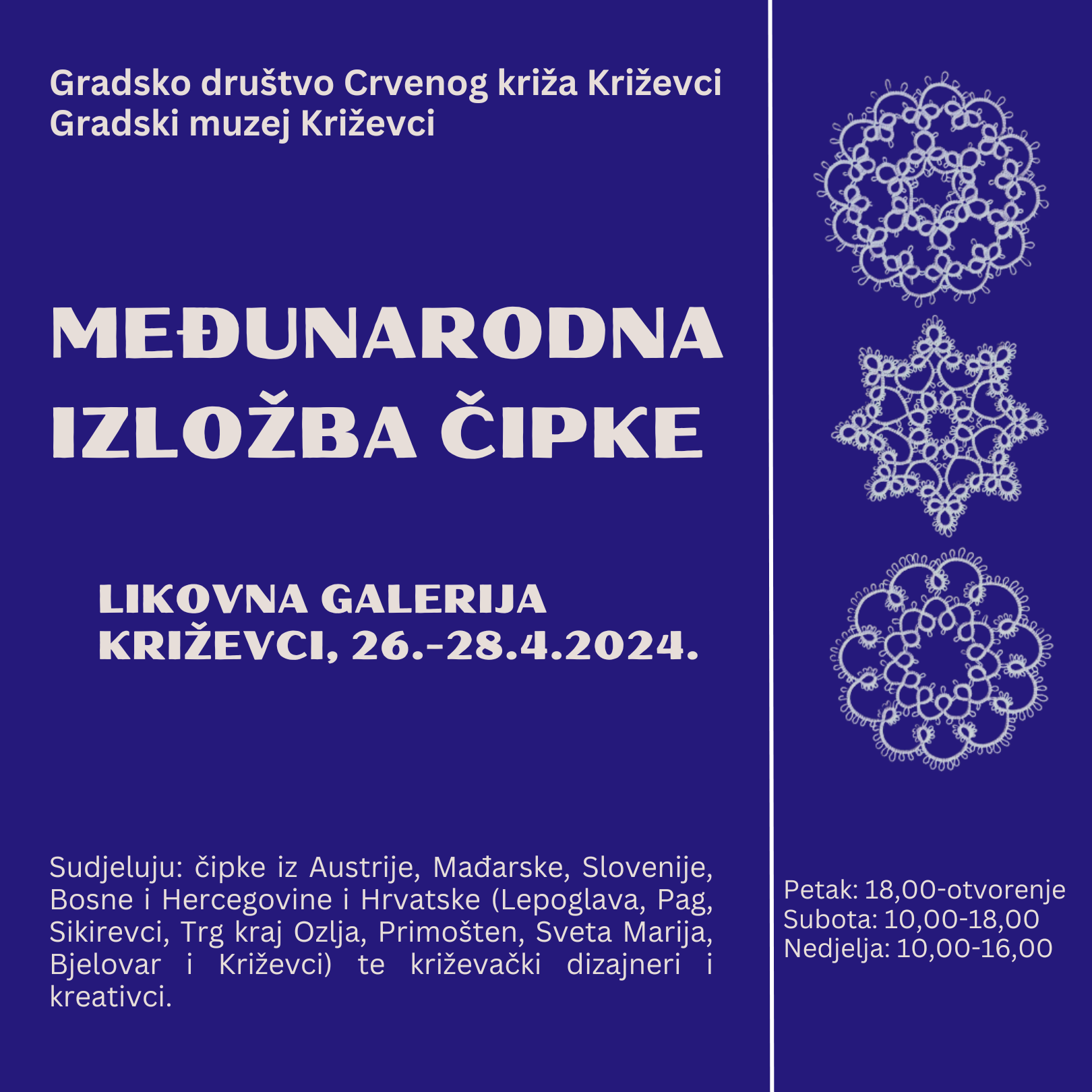 Osim grada Križevaca koji dana slavi rođendan i križevačke čipkarice imaju rođendan – obilježavaju desetu godišnjicu početka izrade čunčane čipke u Gradsko društvu Crvenog križa. Sjajna je to prilika da pokažu svoju i druge poznate čipke na Međunarodnoj izložbi koja se otvara u petak 26. travnja u 18 sati u Likovnoj galeriji Gradskog muzeja Križevci. Posjetitelji izložbe, koja će biti otvorena do nedjelje 28. travnja, moći će razgledati vrijedne radove izlagača iz domaćih i stranih čipkarskih centara Paga, Lepoglave, Trga kraj Ozlja, Sikirevaca, Svete Marije, Primoštena, Bjelovara te Austrije, Mađarske, Slovenije i Bosne i Hercegovine.