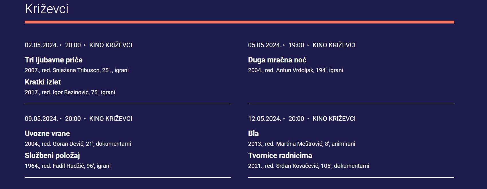 U Kinu Križevci program je počeo u četvrtak, a nastavlja se u nedjelju, 5. svibnja, projekcijom Vrdoljakove Duge mračne noći. U četvrtak 9. svibnja na programu su dva filma; dokumentarac Uvozne vrane i film Fadila Hadžića iz 1964. Službeni položaj. Projekcije u Križevcima završavaju 12. svibnja animiranim filmom Bla i dokumentarcem Tvornice radnicima.