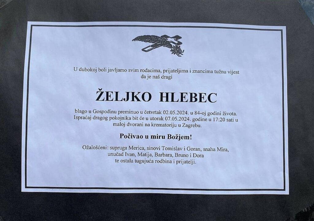 Željko Hlebec preminuo je 2. svibnja u 84. godini života. Ispraćaj dragog pokojnika bit će u utorak, 7. svibnja u 17:20 sati u maloj dvorani na krematoriju u Zagrebu.