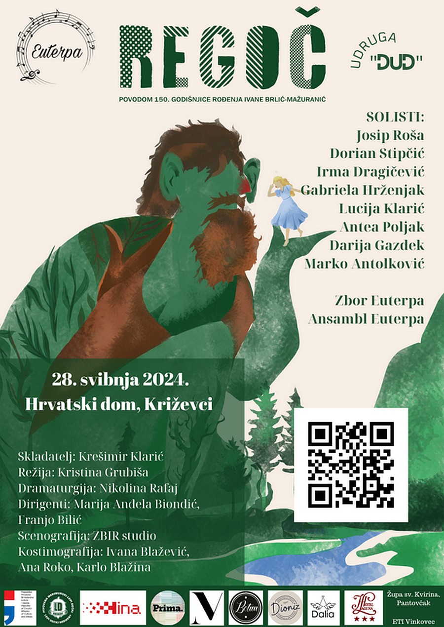 Umjetnička organizacija „Euterpa” i udruga za promicanje kulture „Dud” iz Lonjice u Križevce dovode operu „Regoč”, prema istoimenoj bajci Ivane Brlić Mažuranić. Izvedba će se održati u Velikoj dvorani Hrvatskog doma, u utorak, 28. svibnja 2024. godine s početkom u 10 sati. Ulaznice po cijeni 8 eura mogu se nabaviti putem online sustava Entrio, odnosno rezervirati izravno na web sjedištu organizatora.