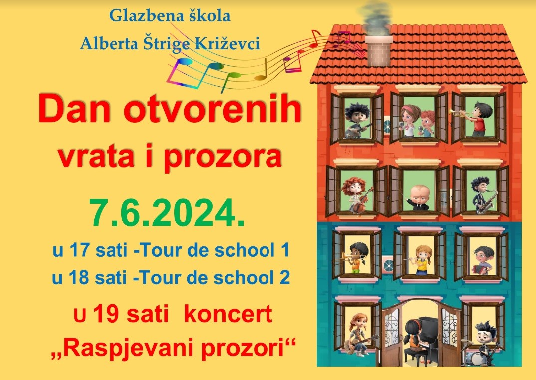 Sve učionice i instrumenti mogu se razgledati u obilasku Glazbene škole u petak 7. lipnja i to u dvije vođene ture – u 17 i u 18 sati, a “raspjevani prozori” otvorit će se u 19 sati kad će mladi križevački glazbenici muzikom dozvati publiku da njihov koncert prati s ulice na adresi Matoševa 4.