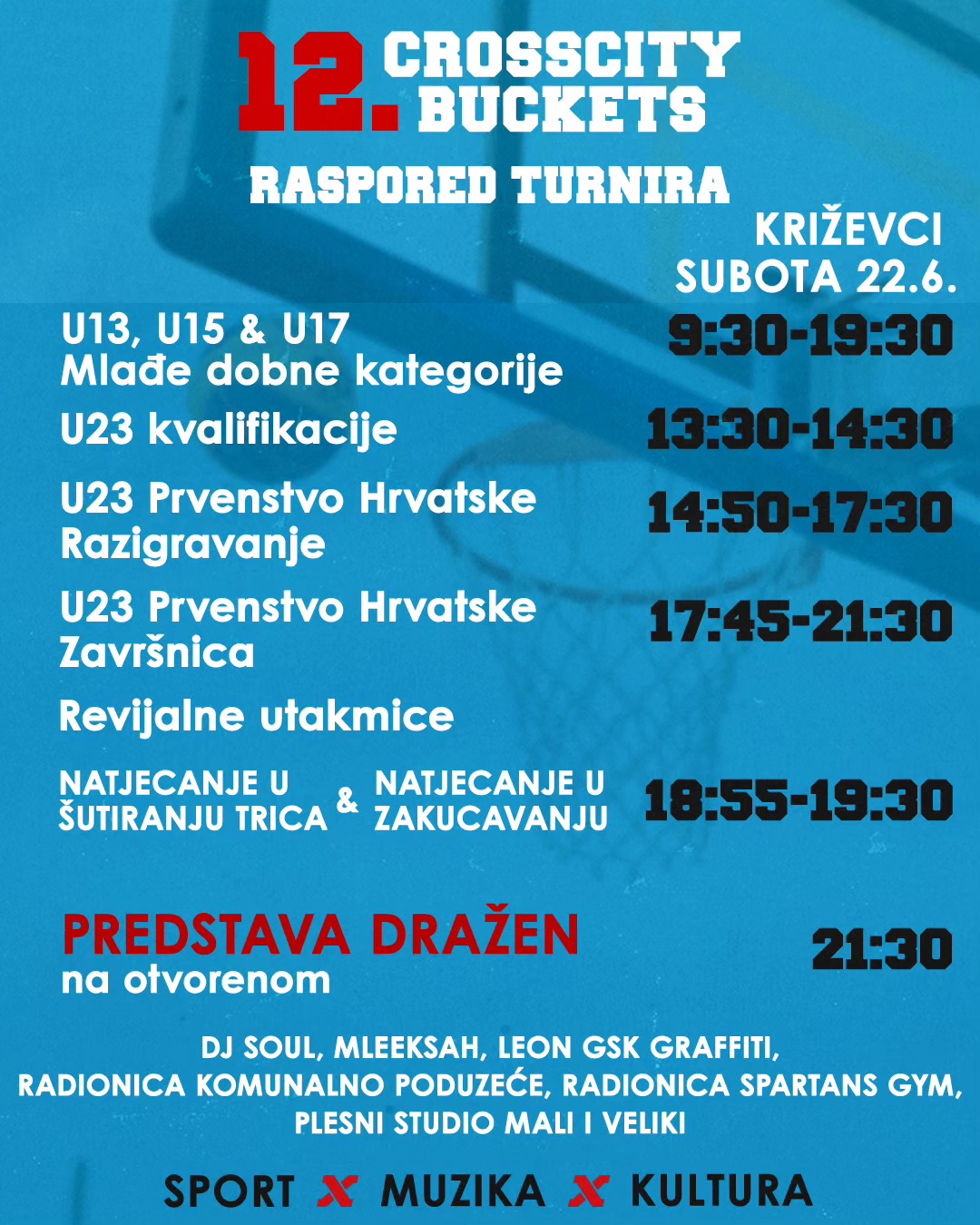 “Od 9:30 do 18 sati igra se isključivo košarka, a od 18 sati krećemo i s dvije radionice Komunalnog poduzeća Križevci i Spartans Gyma. Pored terena bit će i radionica crtanja grafita, koju će provoditi član popularne udruge Graffiti Na Gradele. Kako bi ostalo sve u urbanom stilu kojeg zagovaramo kroz sve godine turnira, imat ćemo i nastupe plesne skupine Mali i veliki koji su pripremili posebne točke, dok nam od izvođača dolazi Mleeksah, koji je osvojio Red Bull Clash i izdao prvi album. Na turniru će promovirati album, ali i uključiti publiku koja će moći direktno sudjelovati u freestyleu i hip-hop umjetnosti. Imat ćemo i novog voditelja, uz našeg stalnog Ivana Mušleka koji je godinama jedan od spikera, priključit će mu se i popularni reper Kandžija, koji također priprema novi album, ali će ovaj puta, umjesto pjevanja, biti sukomentator. Najavljujemo i treći mikrofon na spikerskoj poziciji, jedno izuzetno ugledno ime u ovom svijetu, ali to ćemo sačuvati kao veliko iznenađenje.”