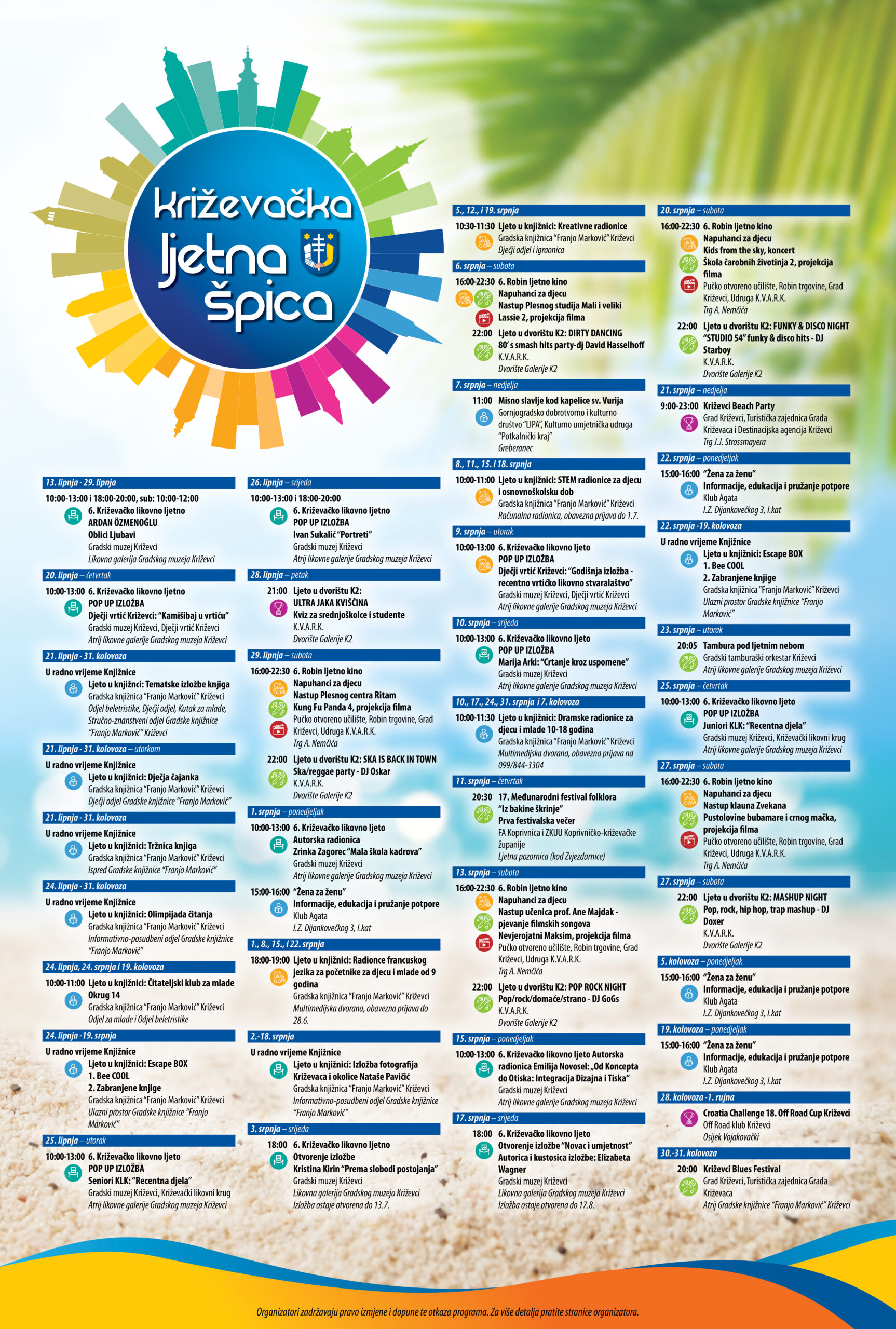 I ovog ljeta su gradske ustanove i udruge te Grad Križevci pripremili niz događanja u sklopu programa Križevačka ljetna špica. Građane očekuje Križevačko likovno ljeto, Ljeto u Gradskoj knjižnici, 7. Robin ljetno kino, Ljeto u dvorištu Galerije K2, program udruge Agata “Žena za ženu”, Međunarodni festival folklora “Iz bakine škrinje”, Tambura pod ljetnim nebom te Croatia Challange Off Road Cup Križevci.