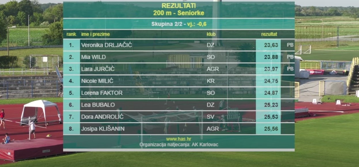Veronika Drljačić (22), Križevčanka koja trči za AK Dinamo-Zrinjevac, potvrdila je svoju višegodišnju dominaciju i na 200 metara na pojedinačnom seniorskom prvenstvu Hrvatske u atletici u Karlovcu. Ona je danas peti put uzastopno osvojila naslov državne prvakinje na toj dionici s istrčanim osobnim rekordom, 23,63 i uzvratila je osječkoj atletičarki Miji Wild koja ju je jučer nadjačala na dvostruko kraćoj dionici.