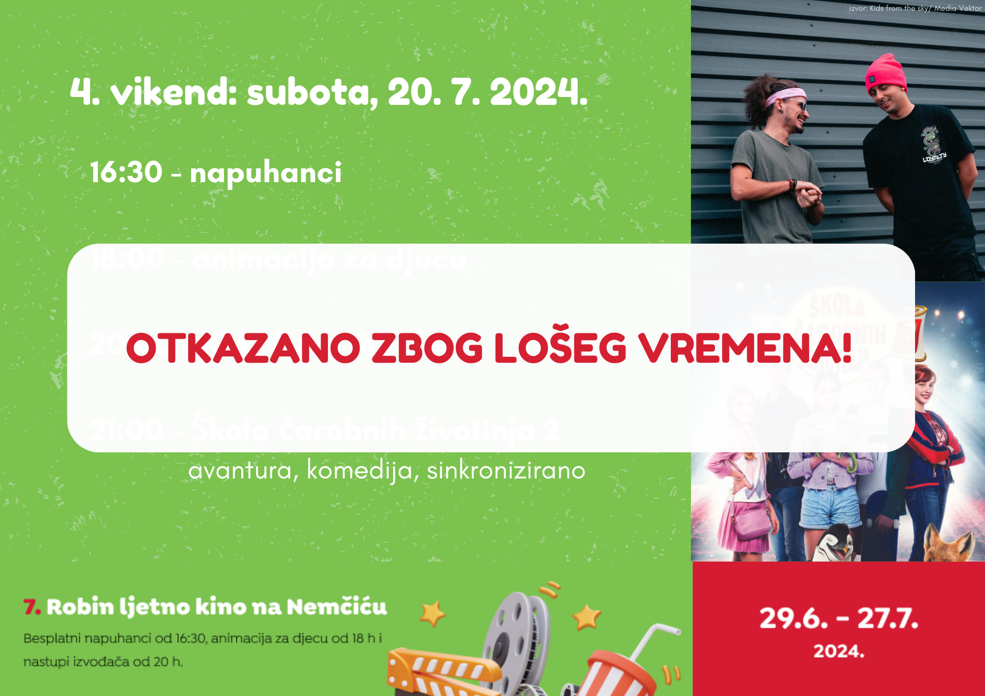Pučko otvoreno učilište Križevci, zajedno s drugim organizatorima najavilo je kako se otkazuje večerašnji program 7. Robin ljetnog kina na Nemčiću. Razlog otkazivanja je najavljeno loše vrijeme, zbog kojeg nije moguće organizirati projekciju i popratne sadržaje na otvorenom. Organizatori zahvaljuju na razumijevanju!