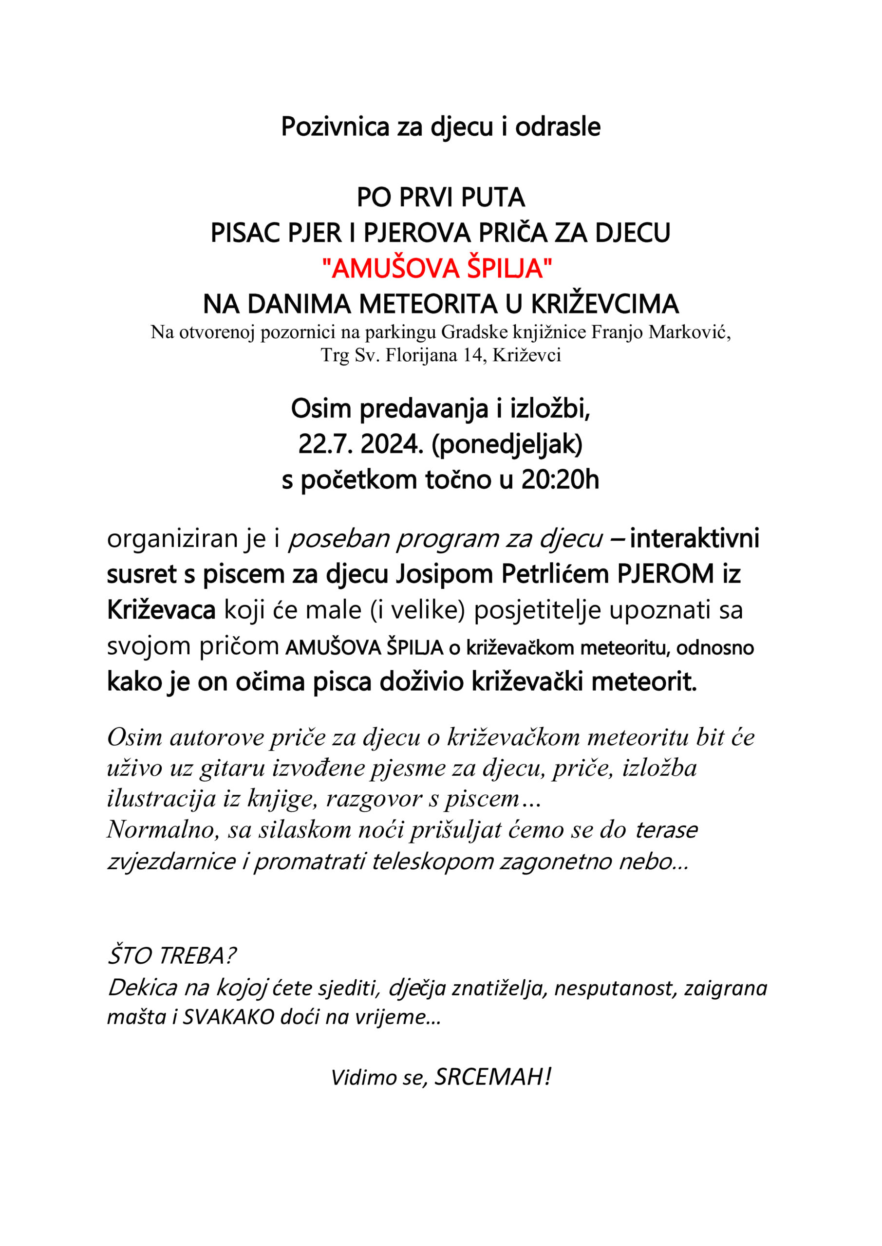 U sklopu programa obilježavanja desete obljetnice priznanja meteorita Križevci i objavljivanja u svjetskom registru meteorita, Astronomsko društvo Perzeidi priprema večeras program za djecu u suradnji s križevačkim piscem Josipom Petrlićem Pjerom. Prenosimo pozivnicu na taj program s piščevog bloga, uz napomenu da će se u slučaju lošeg vremena program premjestiti u prostorije Kozmološkog centra (zvjezdarnice) koji se nalazi odmah do predviđene ljetne pozornice, a promatranje neba će u tom slučaju (nažalost) biti otkazano.