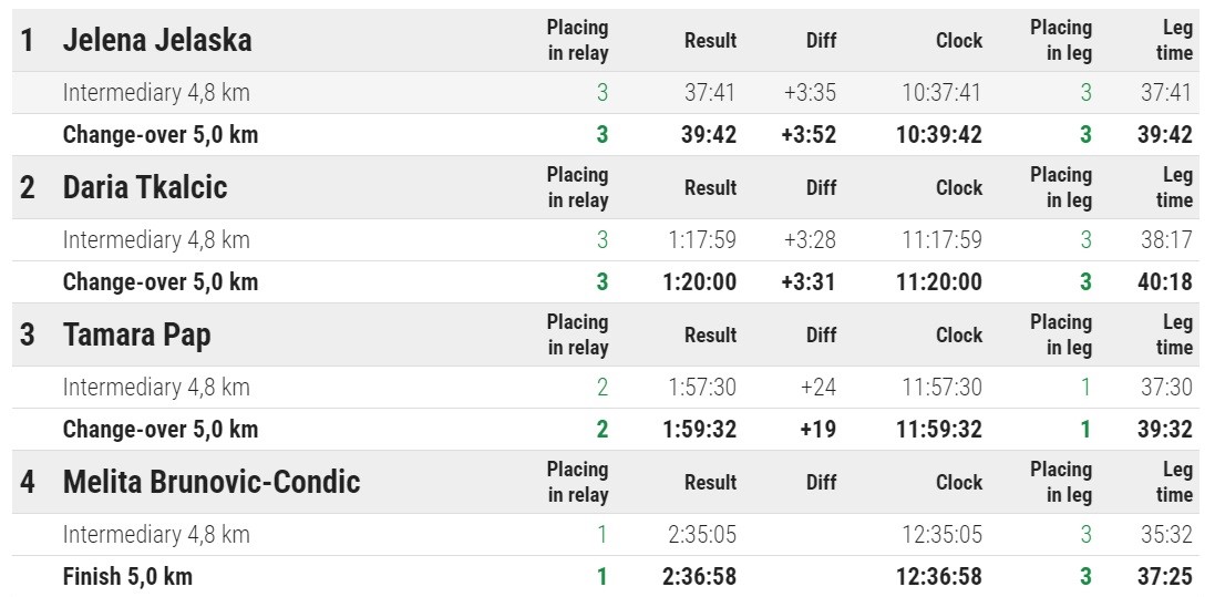 Od drugoplasirane štafete Latvije bile su brže 38 sekundi, nastupile su kao treća i četvrta izmjena i dobro su “potegnule” za svoj tim. Posebno je ubrzala Melita u zadnjoj izmjeni završivši svoju dionicu s vremenom 37:25. Hodačice iz Atletskog kluba Križevci kao članice hrvatske reprezentacije na ovom su Svjetskom prvenstvu osvojile četiri medalje, tri zlata i jednu broncu, i na postolju su bile u svakoj utrci u kojoj su nastupile. Za natjecanje ih je pripremala njihova trenerica Snježana Mergon.