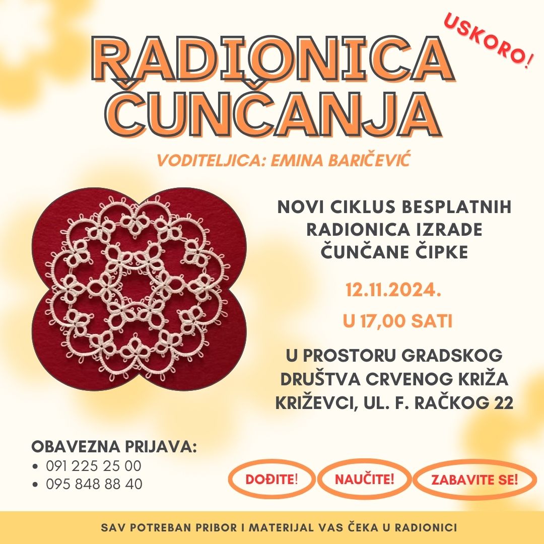 Građani zainteresirani za tečaj čunčanja trebaju se javiti voditeljici Emini Baričević na broj 095/ 848-8840 ili u Gradsko društvo Crvenog križa na broj 091/225-2500. Sav potreban pribor i materijal osigurat će organizatori.