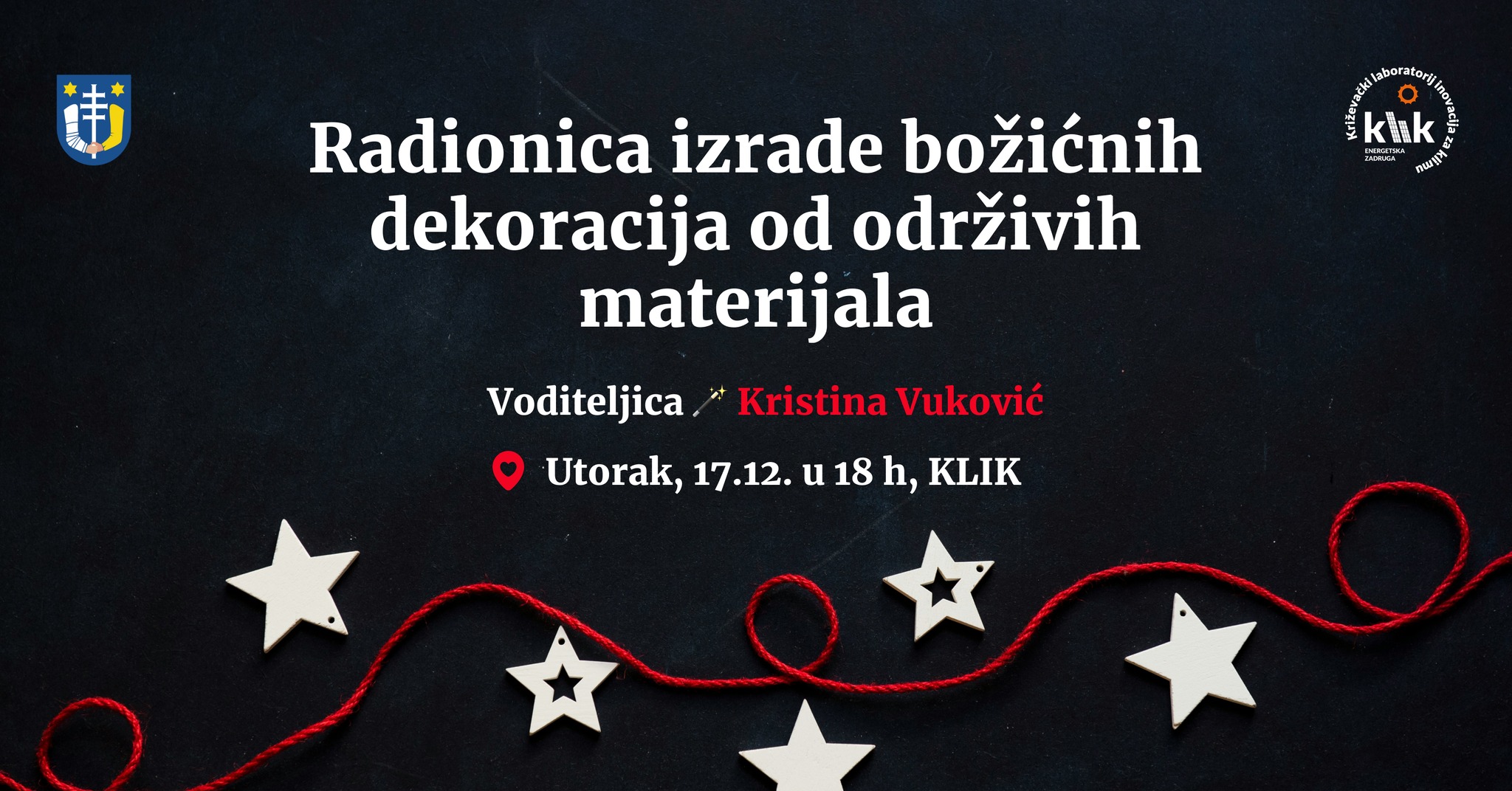 U utorak, 17. prosinca u Energetsko-klimatskom uredu u Križevcima, održana je radionica izrade božićnih dekoracija od održivih materijala. Organizator radionice bila je energetska zadruga KLIK (punim nazivom: Križevački laboratorij inovacija za klimu). Okupljeni sudionici su uz profesoricu likovne kulture, Kristinu Vuković prije svega naučili da božićne dekoracije ne moraju nužno biti napravljene od plastike, baš kao što ni darovi nisu “po defaultu” umotani u celofan.