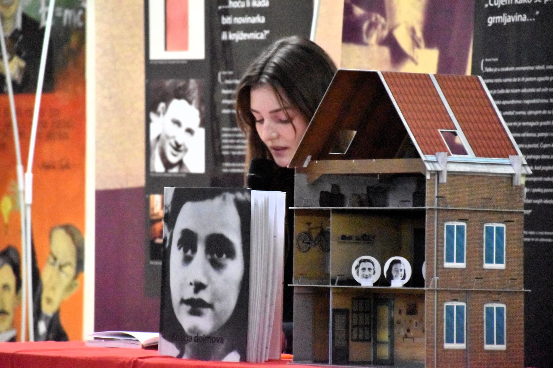 “U školi svake godine u siječnju obilježavamo Dan sjećanja na žrtve holokausta kroz filmove, izradu plakata i ove godine sam tražila nešto u čemu bi mogao sudjelovati veliki broj naših učenika“, ispričala je profesorica njemačkog jezika Martina Koritić Wytwer kako je ova izložba dospjela u križevačku gimnaziju. Njena ideja da učenici budu i aktivni nosioci priče idealno se uklopila u koncept izložbe. Važan element je upravo vršnjačka edukacija i učenici su, u svakom gradu gdje izložba gostuje, voditelji kroz Anninu priču. Nekoliko naših gimnazijalaca prošlo je trening Hrvatske edukacijske i razvojne mreže za evoluciju sporazumijevanja (HERMES) i Kuće Anne Frank iz Amsterdama. Zrinka, jedna od njih, danas je pročitala ulomak iz Dnevnika Anne Frank.