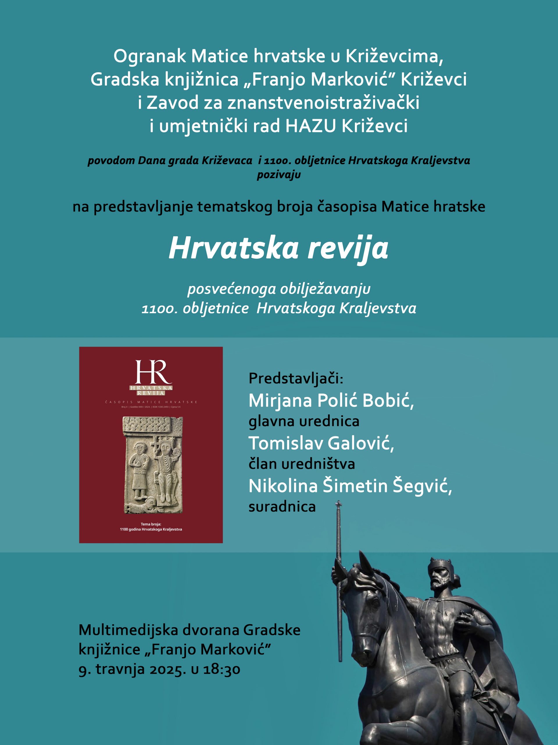Ogranak Matice hrvatske u Križevcima, Zavod za znanstvenoistraživački i umjetnički rad HAZU Koprivničko-križevačke županije i Gradska knjižnica „Franjo Marković“ pozivaju na predstavljanje tematskog broja časopisa Matice hrvatske Hrvatska revija posvećenoga obilježavanju 1100. obljetnice Hrvatskoga Kraljevstva i povijesnoj ličnosti kralja Tomislava i njegovom vremenu, povijesti proučavanja te problematike, povijesnom pamćenju i mitu o kralju Tomislavu u Hrvata, te prikazivanju Tomislavova lika i vremena u likovnim umjetnostima.