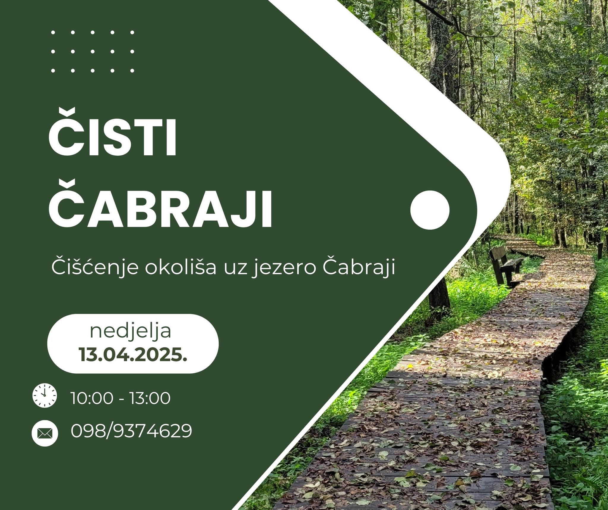 U nedjelju, 13. travnja, od 10 do 13 sati održat će se čistka i druženje pod nazivom Čisti Čabraji – zajednička akcija za prirodu! Radi se o akciji čišćenja okoliša uz jezero Čabraji – zaštićene prirodne oaze i važnog močvarnog staništa.