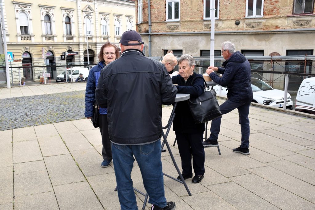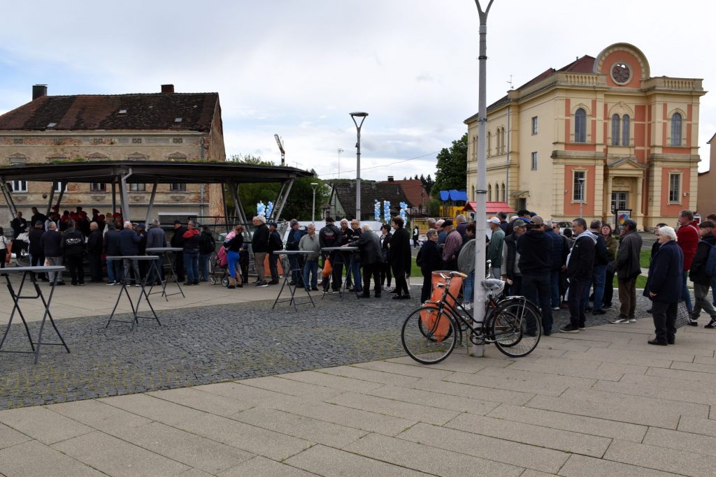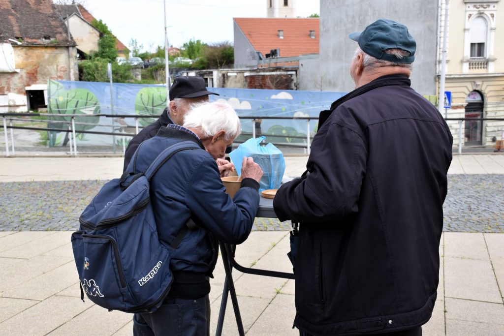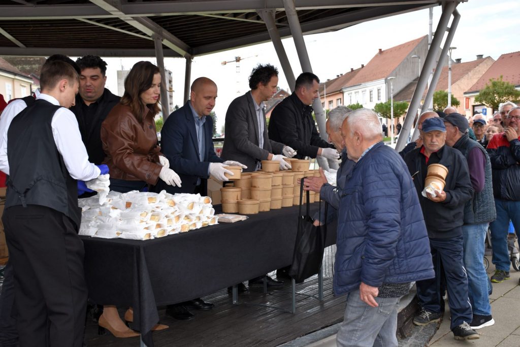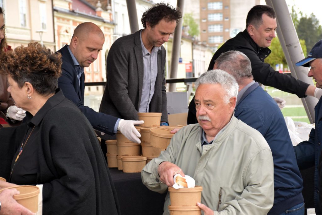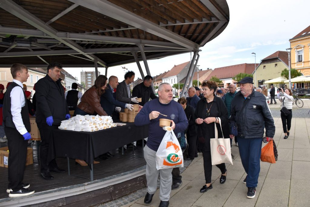 I ove godine su brzo podijeljene porcije tradicionalnog posnog obroka na Veliki petak na Strossmayerovom trgu. U redu ispred paviljona čekalo se i prije početka podjele zakazane za 10 sati, a kuhali su učenici Srednje škole “Ivan Seljanec” s mentorima Mišelom Doskočilom i Borom Petrekom. Ukupno je bilo, rekli su nam mentori, oko 600 porcija prženih srdela. Učenicima su u podjeli pomagali gradonačelnik, njegov zamjenik i gradski pročelnici.