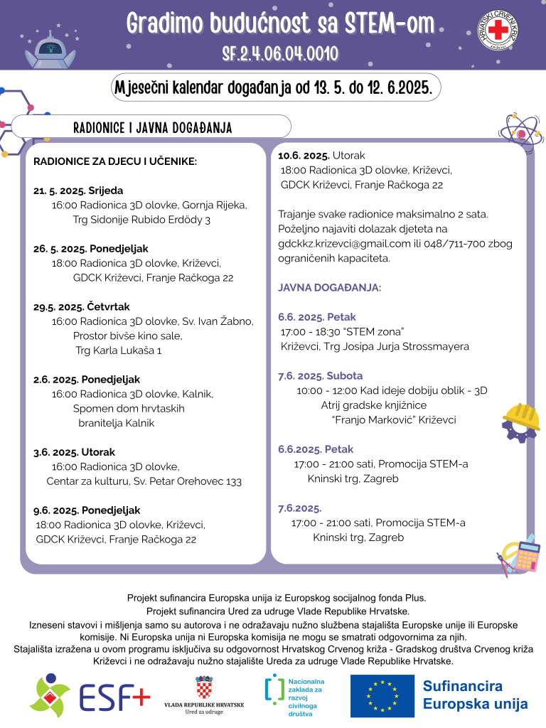Gradsko društvo Crvenog križa poziva roditelje da prijave svoju djecu na radionice koje u sklopu projekta “Gradimo budućnost sa STEM-om” nude od 13. svibnja do 12. lipnja i na njima zajedno otkrivaju svijet znanosti, tehnologije, inženjerstva i matematike. Raspored događanja s terminima i temama pojedinih radionica dostupan je i na mrežnim stranicama te na Facebook profilu Gradskog društva Crvenog križa Križevci.