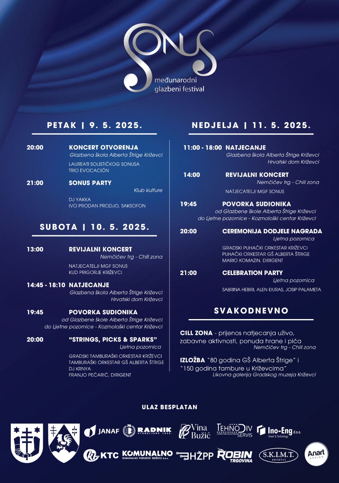 Grad Križevci je od 9. do 11. svibnja 2025. godine domaćin velikog Međunarodnog glazbenog festivala SONUS, koji već tradicionalno okuplja mlade glazbenike, ansamble, orkestre i publiku iz Hrvatske i inozemstva. Ove godine prijavljeno je 24 sastava, 195 sudionika te preko 120 revijalnih izvođača. U organizaciji Glazbene škole Alberta Štrige, festival donosi bogat trodnevni program prepun koncerata, natjecanja, kulturnih sadržaja i zabave – a sve uz besplatan ulaz.