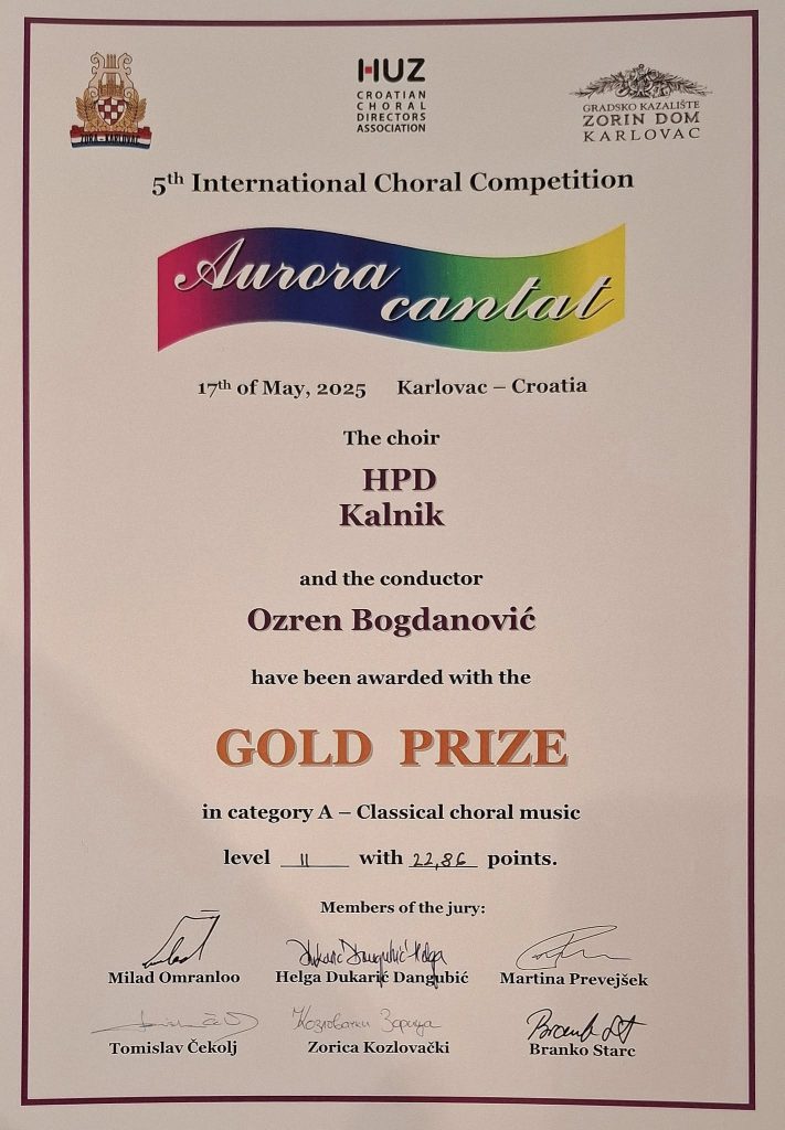 Hrvatsko pjevačko društvo Kalnik večeras je u Karlovcu na 5. međunarodnom natjecanju zborova “Aurora cantat” osvojilo zlatnu plaketu u A-kategoriji klasične zborske glazbe. Križevački su zboraši na istom natjecanju zlatom ovjenčani drugu godinu zaredom, a uspjeh je ponovio i dirigent Ozren Bogdanović, još jednom osvojivši nagradu “David Meisel” za osobiti umjetnički dojam i uspješan dirigentski rad.