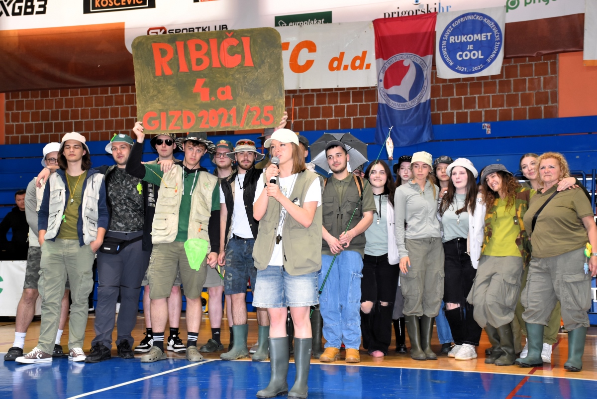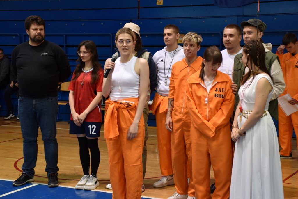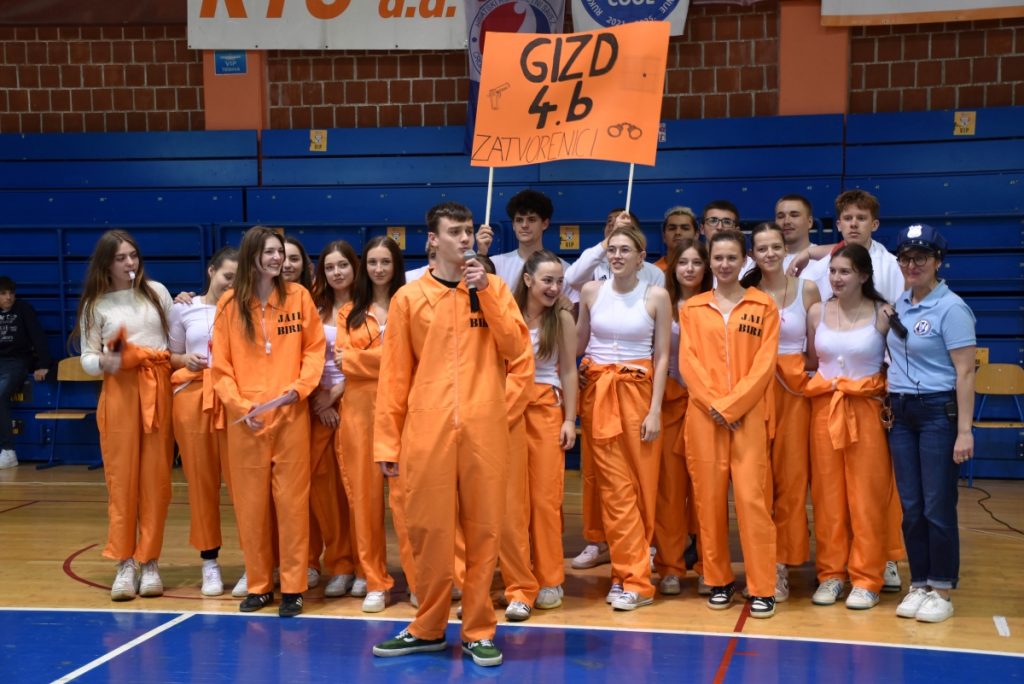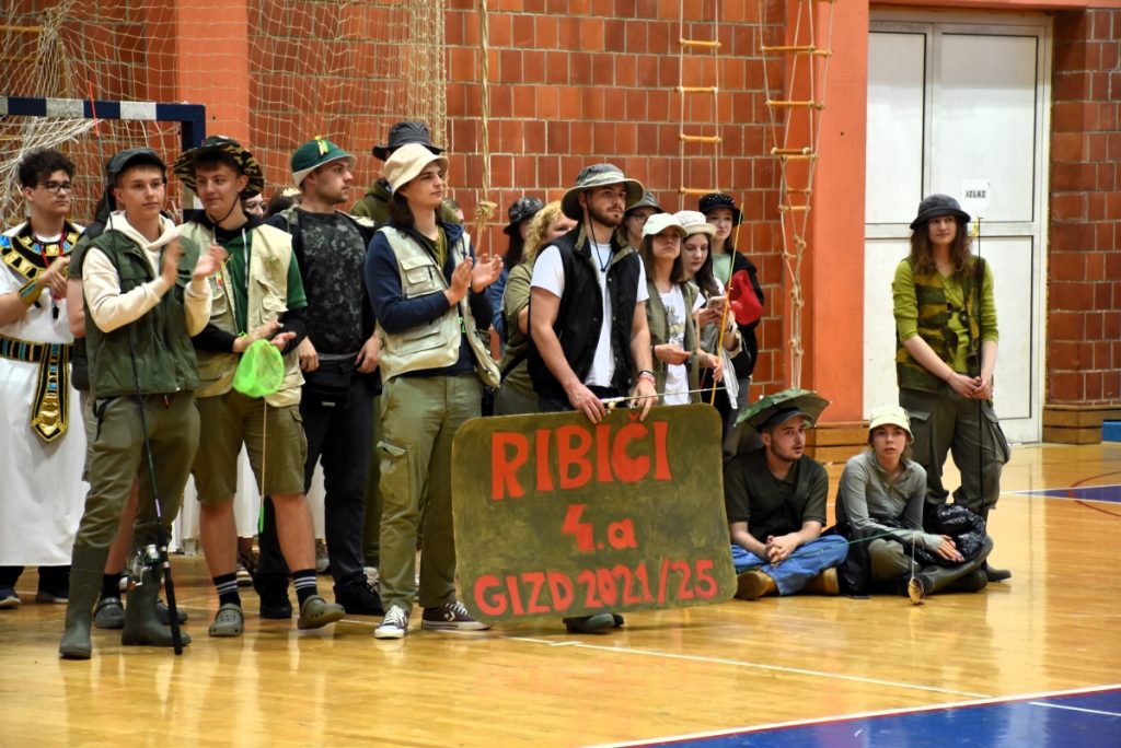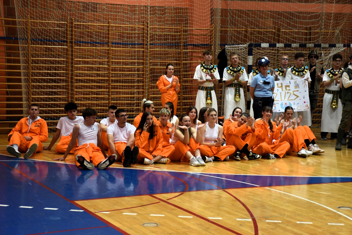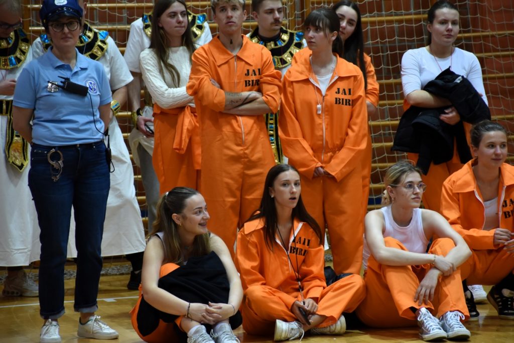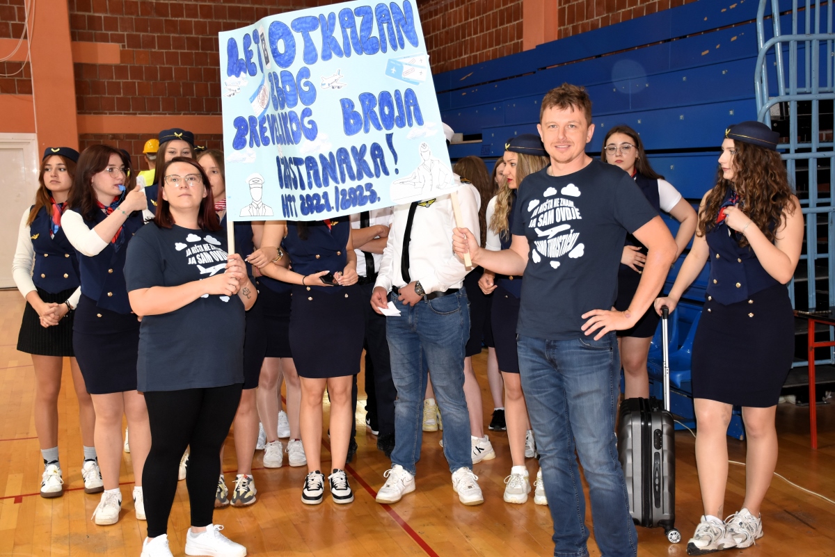 Ribiči, stjuardese i piloti, zatvorenici uz razrednicu policajku, pripadnici drevnih i suvremenih naroda, građevinari i sportaši – to su bile teme kostima ovogodišnjih maturanata koji su se jučer, umjesto na Strossmayerovom trgu, zbog lošeg vremena od škole simbolično oprostili u sportskoj dvorani. Prigodnim govorima obratili su im se ravnatelji Ivan Peklić, Toni Svoboda, Gordana Juran Ratković i Branka Špoljar, poželjeli su im sreću na ispitima, u budućem školovanju i pronalasku posla, a uime Grada im se obratio gradonačelnik Mario Rajn.