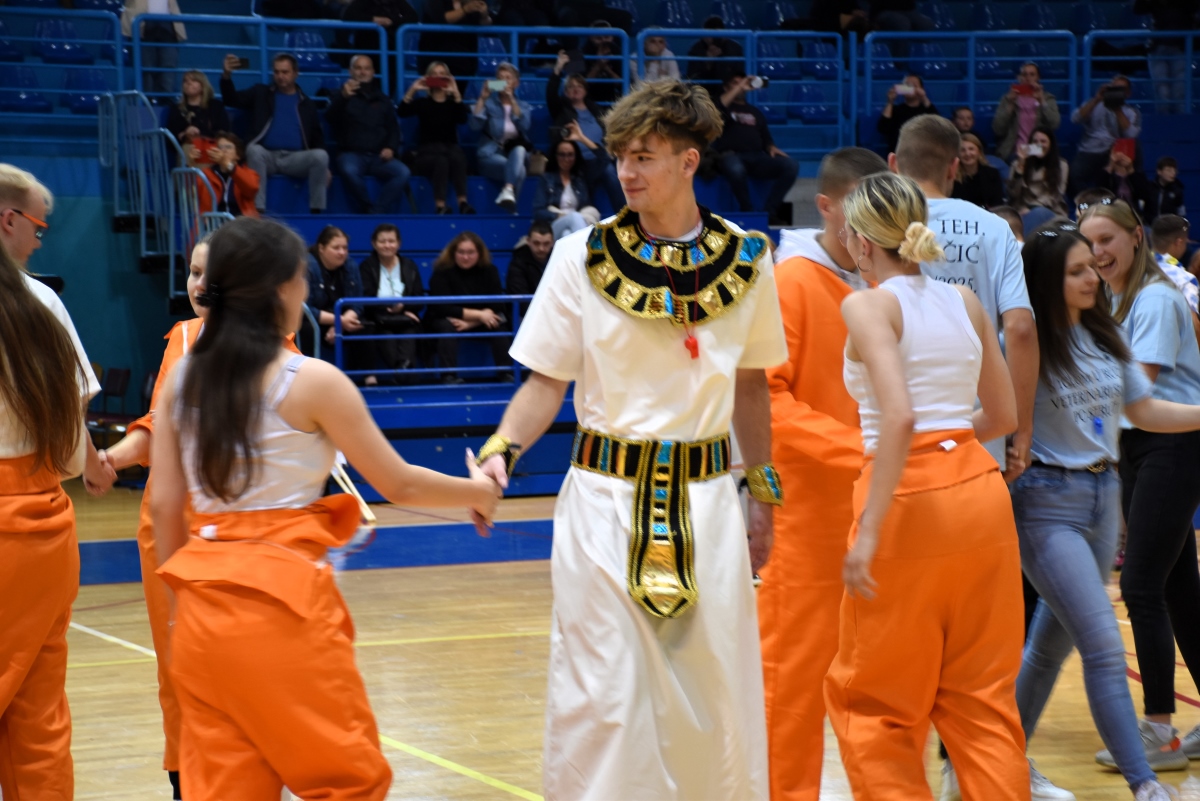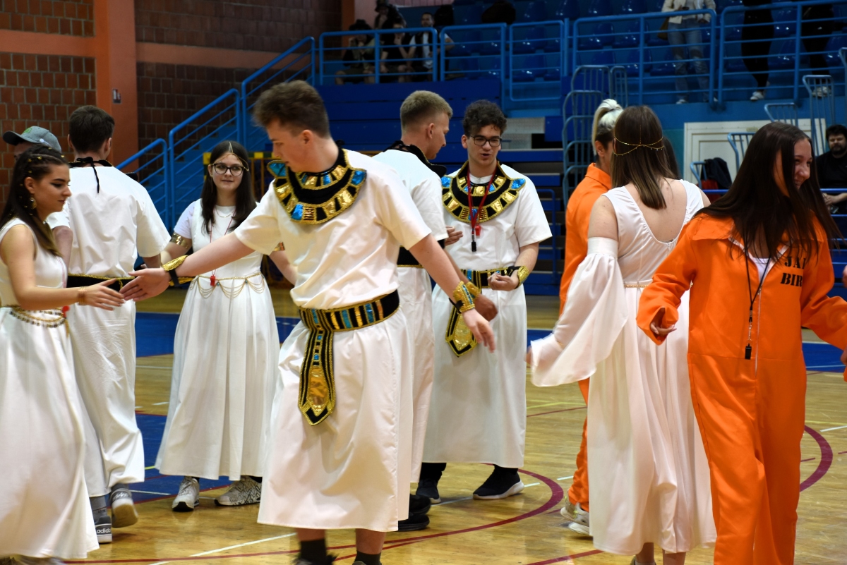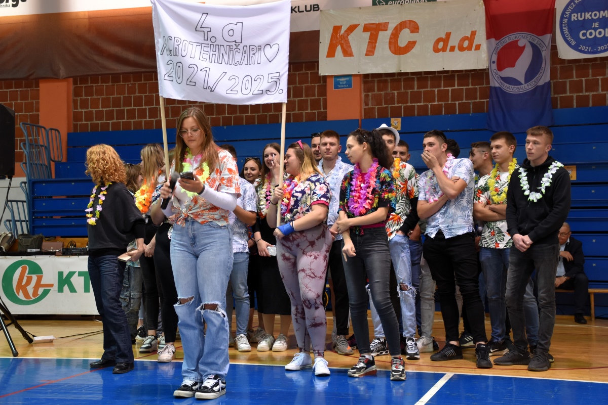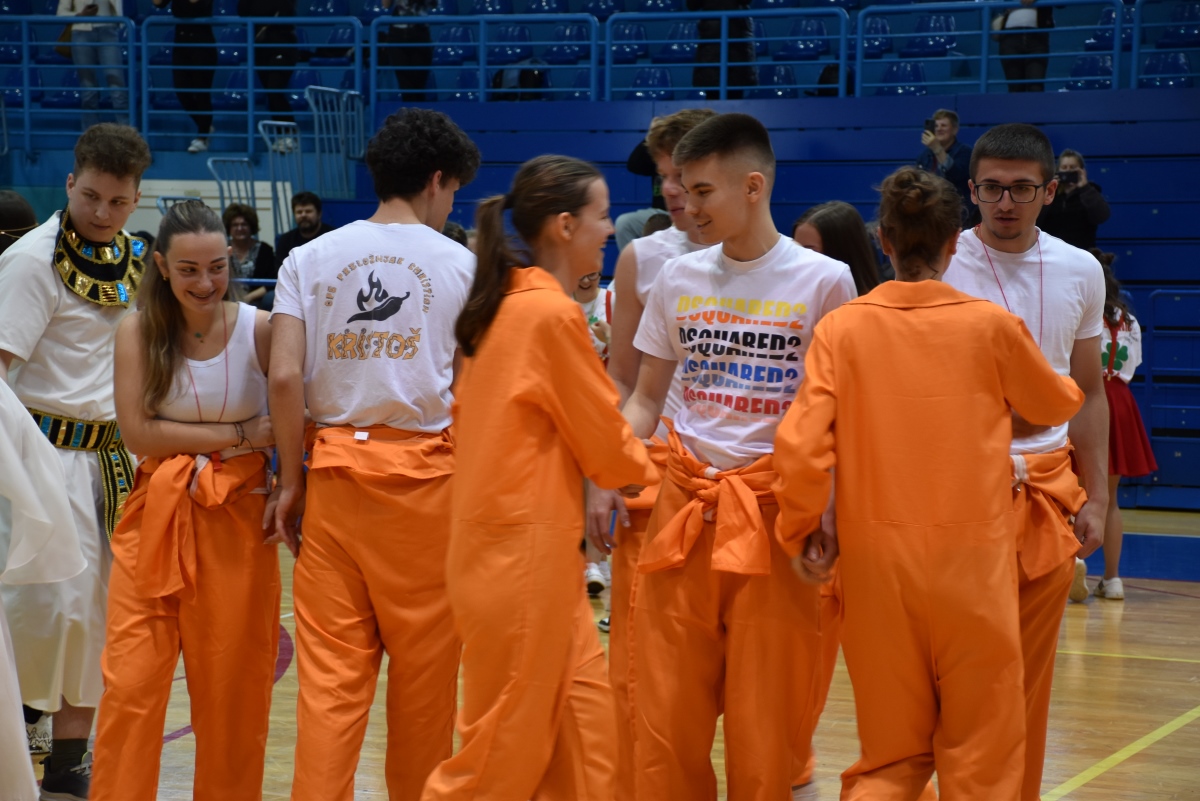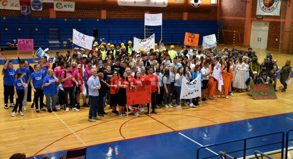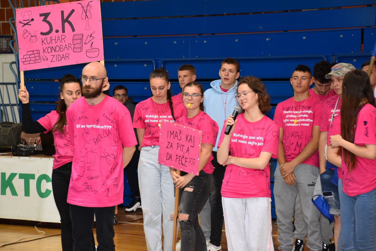 Ribiči, stjuardese i piloti, zatvorenici uz razrednicu policajku, pripadnici drevnih i suvremenih naroda, građevinari i sportaši – to su bile teme kostima ovogodišnjih maturanata koji su se jučer, umjesto na Strossmayerovom trgu, zbog lošeg vremena od škole simbolično oprostili u sportskoj dvorani. Prigodnim govorima obratili su im se ravnatelji Ivan Peklić, Toni Svoboda, Gordana Juran Ratković i Branka Špoljar, poželjeli su im sreću na ispitima, u budućem školovanju i pronalasku posla, a uime Grada im se obratio gradonačelnik Mario Rajn.