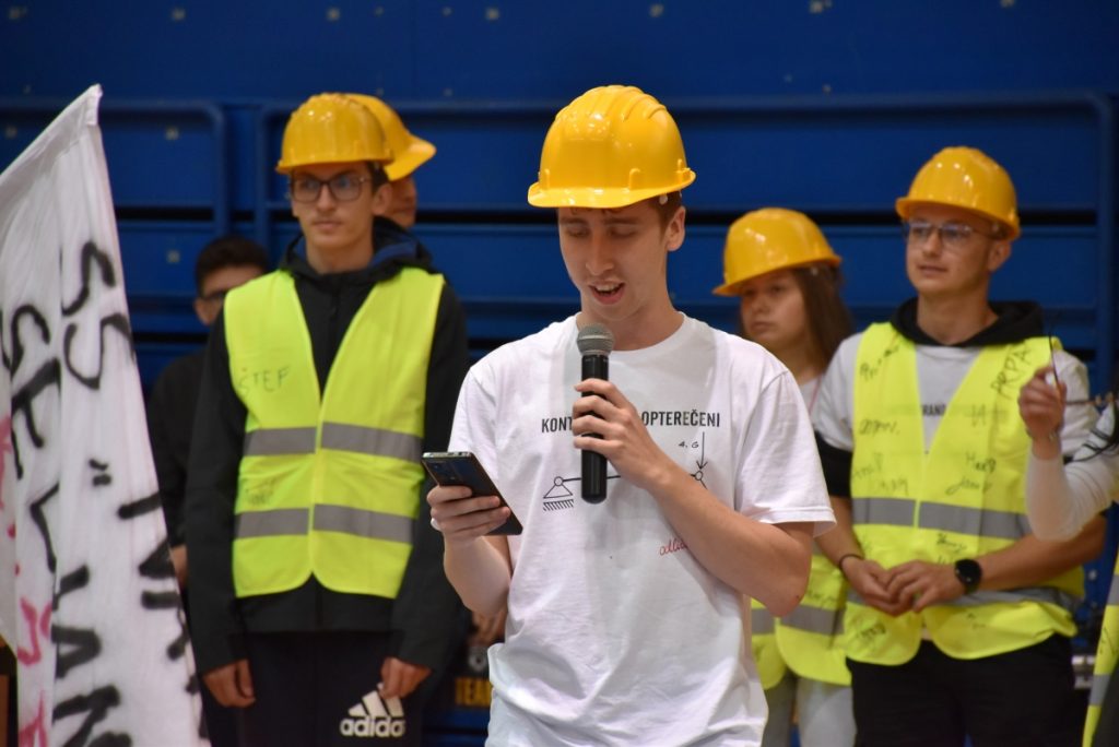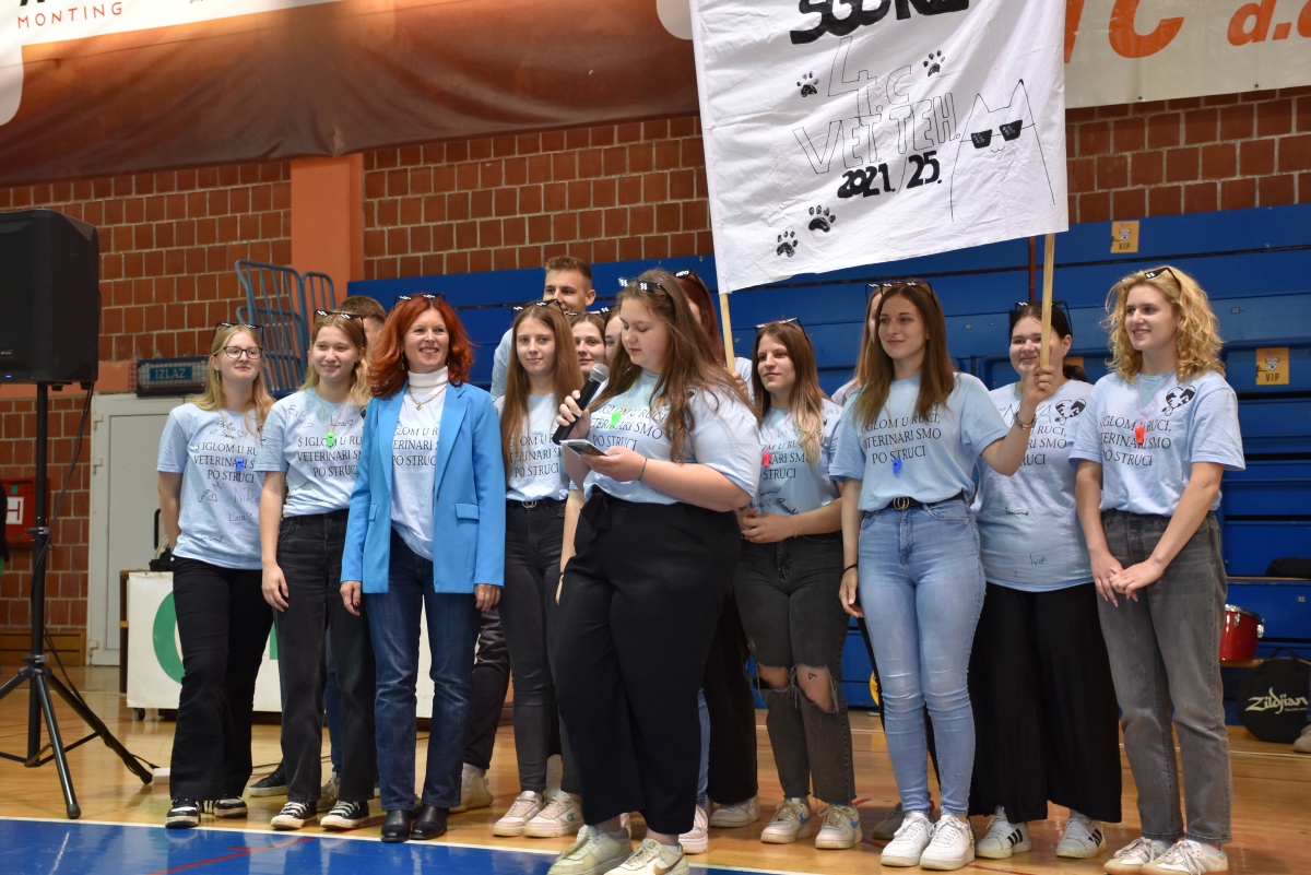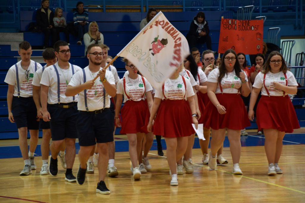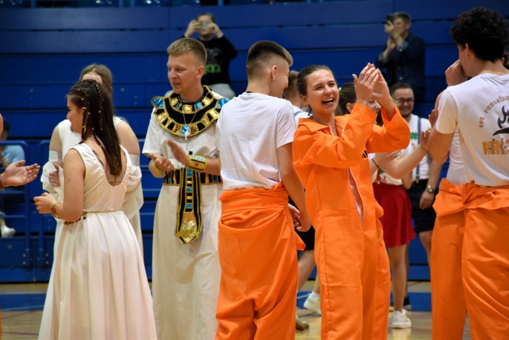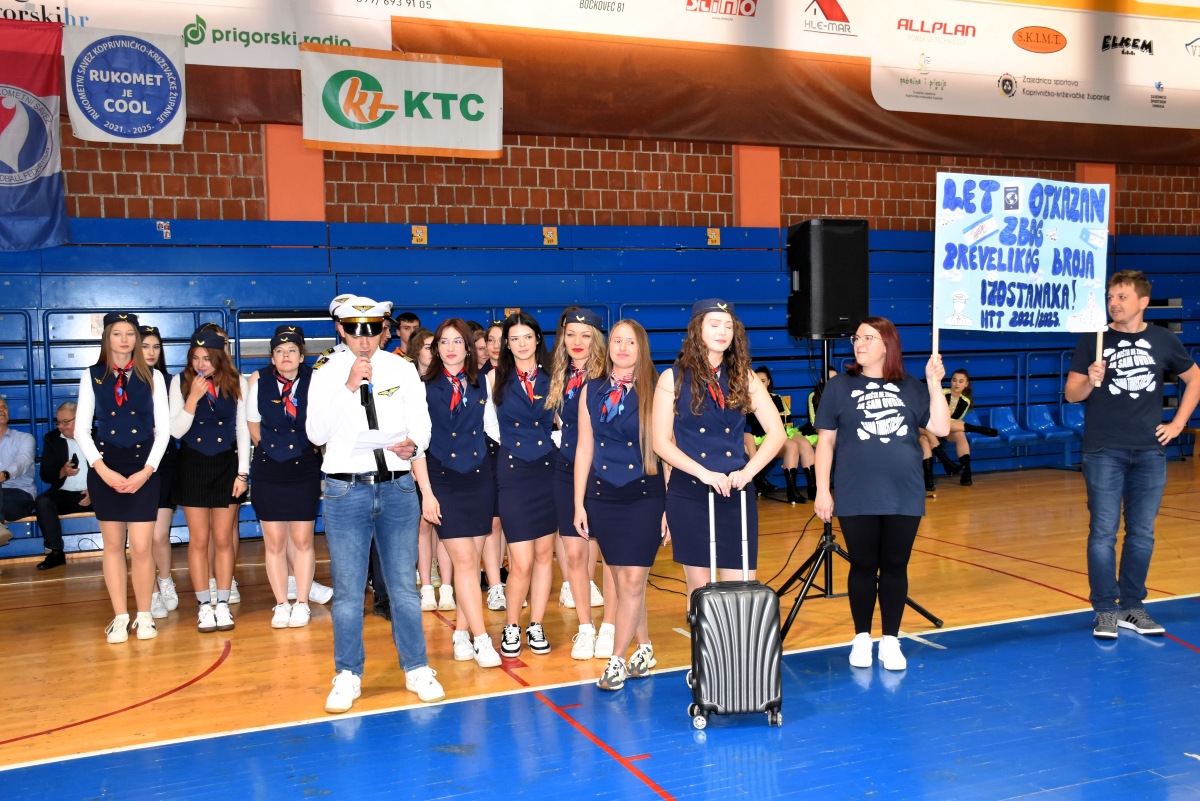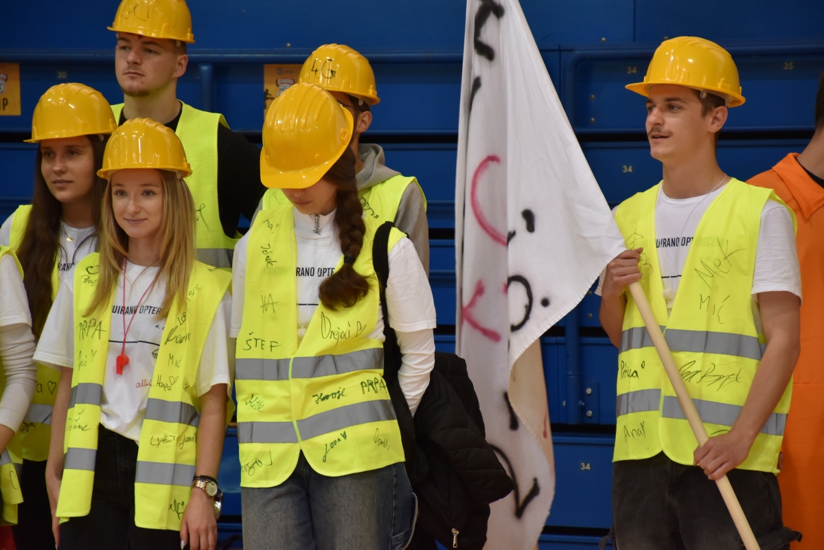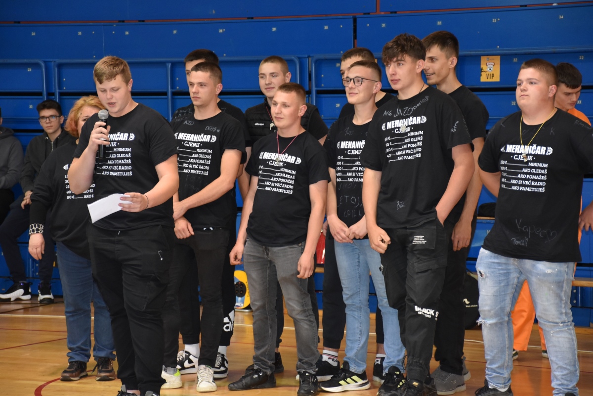 Ribiči, stjuardese i piloti, zatvorenici uz razrednicu policajku, pripadnici drevnih i suvremenih naroda, građevinari i sportaši – to su bile teme kostima ovogodišnjih maturanata koji su se jučer, umjesto na Strossmayerovom trgu, zbog lošeg vremena od škole simbolično oprostili u sportskoj dvorani. Prigodnim govorima obratili su im se ravnatelji Ivan Peklić, Toni Svoboda, Gordana Juran Ratković i Branka Špoljar, poželjeli su im sreću na ispitima, u budućem školovanju i pronalasku posla, a uime Grada im se obratio gradonačelnik Mario Rajn.