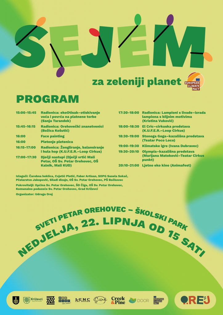 U nedjelju, 22. lipnja, od 15 do 21 sati, Udruga Orej čeka vas u školskom parku u Svetom Petru Orehovcu s nikad bogatijim programom i zelenim idejama koje slave održivost i snagu zajednice. U sklopu Sejma bit će održane raznovrsne aktivnosti, koje su detaljno prikazane u nastavku članka i programu. Kao i prošle godine, u parku vas čeka orehovečka rivijera, face painting i pletenje pletenica za pravo opuštanje.