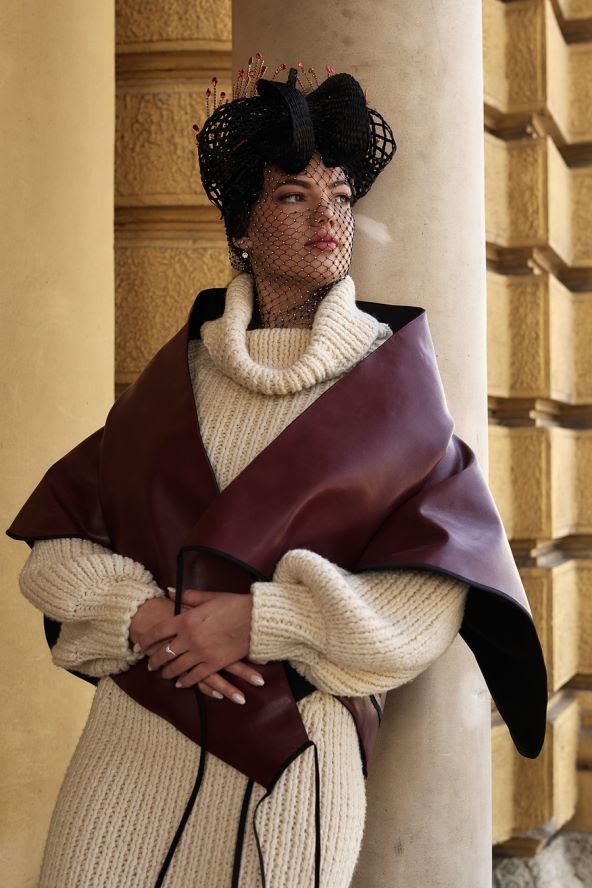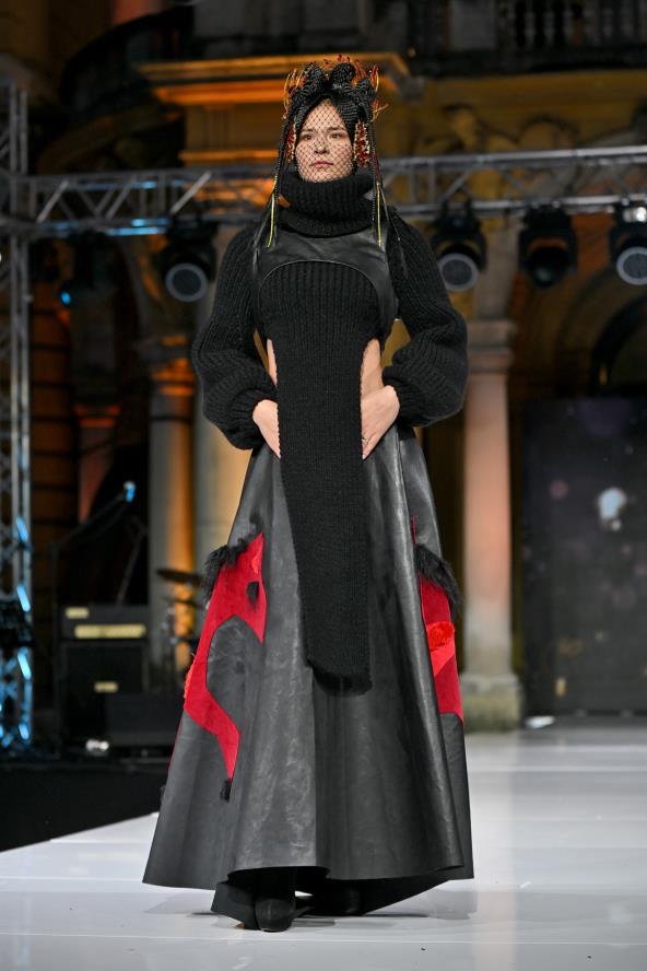 “Pletene jednobojne haljine u crnoj, bordo i bijelo-krem boji ovaj put su bile u podlozi, a gornji odjevni predmeti su od kože, impregniranih tkanina od konoplje koje vizualno izgledaju kao koža s elementima kolažiranih etnoloških motiva. To su motivi kakvi su se pojavljivali na starim slavonskim ponjavama, prekrivačima koji su se u prošlosti puno koristili u različite svrhe“, objašnjava Galaš.