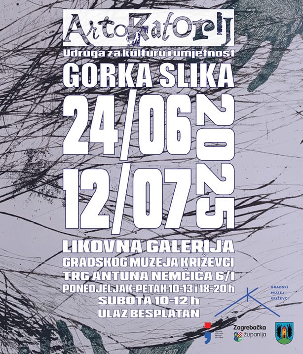 Izložbu “Gorka slika” izvorno je osmislila i organizirala Udruga Artoratorij, koja je ujedno pokrenula i istoimeni likovni natječaj te premijerno ugostila izložbu u svom prostoru u Vrbovcu, a sad gostuje u našoj galeriji. Indirektna inspiracija za sudionike izložbe bila je i Marija Jurić Zagorka, čiji je izazovan život i izniman književni, novinarski i feministički doprinos bio polazište za sam književni natječaj. Izložba Gorka slika tako nastavlja dijalog između književnog i likovnog izraza, potičući promišljanje o emocijama koje su često potisnute, ali prisutne.