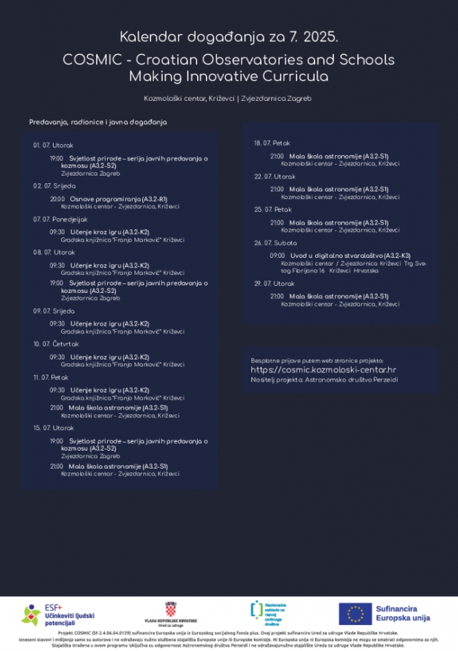 Projekt “COSMIC – Croatian Observatories and Schools Making Innovative Curricula” i ovog mjeseca nudi bogat izbor aktivnosti za sve uzraste: