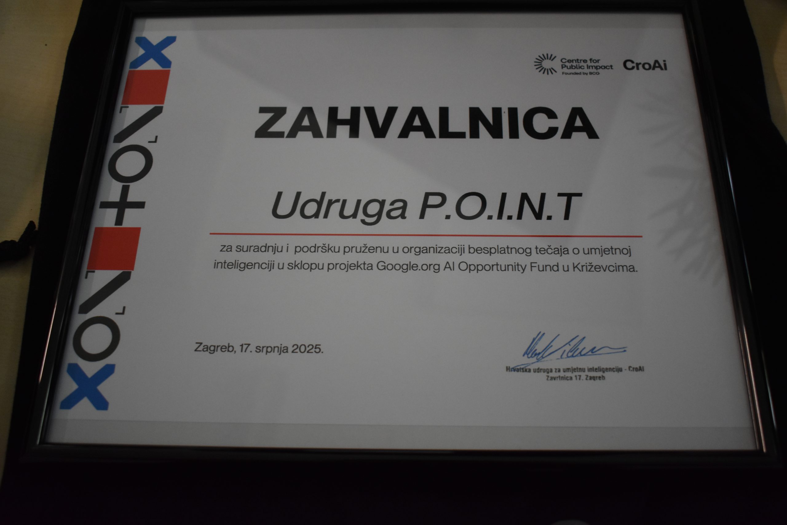 Cilj europske inicijative Google.org AI Opportunity Fund je smanjenje digitalnog jaza, otvaranje novih prilika za zapošljavanje i jačanje konkurentnosti radne snage. Kako umjetna inteligencija postaje ključan dio poslovanja, važno je osigurati da nitko ne zaostaje u digitalnoj transformaciji. Kroz ovaj tečaj, sudionici su stekli praktična znanja za primjenu AI tehnologija u svom profesionalnom okruženju. Tečaj je završio dodjelom certifikata polaznicima, udruga CroAI nakon organizacije tečaja u Bjelovaru i Križevcima najavljuje gostovanja u južnijim krajevima Hrvatske, a moguće i na otocima.