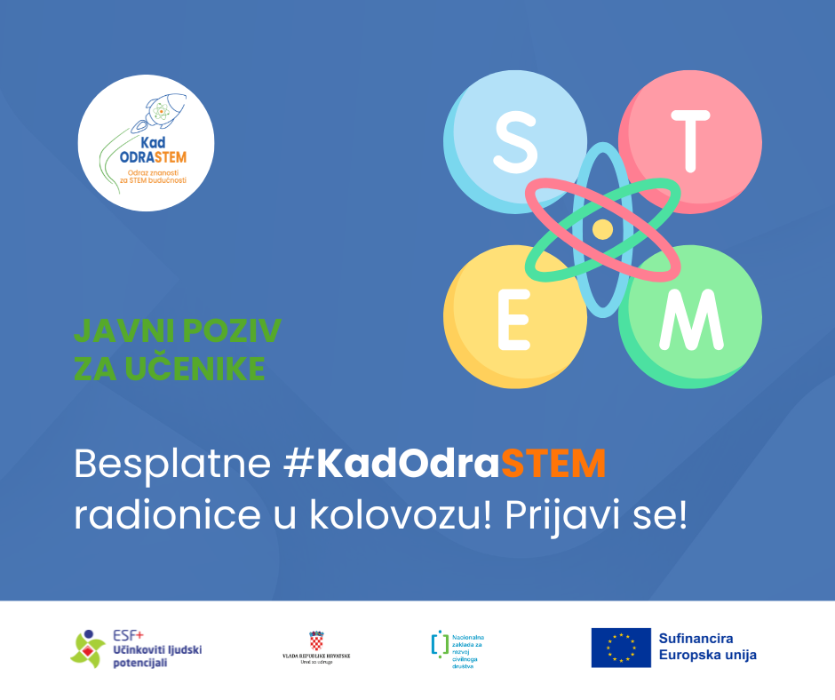 Sufinanciranje: Europska unija iz Europskog socijalnog fonda plus (ESF+) – Jačanje kapaciteta organizacija civilnoga društva za popularizaciju STEM-a (85 %); Državni proračun (15 %)Izneseni stavovi i mišljenja samo su autorova i ne odražavaju nužno službena stajališta Europske unije ili Europske komisije. Ni Europska unija niti Europska komisija ne mogu se smatrati odgovornima za njih.
