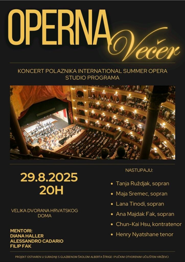 International Summer Opera Studio, održavao se od 23. do 29. kolovoza u prostorima Hrvatskog doma i Glazbene škole Alberta Štrige u suradnji s Glazbenom školom Alberta Štriga i Pučkim otvorenim učilištem Križevci. Program uključuje radionice operne interpretacije i vokalne tehnike na kojima su pjevači radili svakodnevno od 10 do 15 sati. Vrhunac programa je večerašnji koncert profesionalnih opernih pjevača u velikoj dvorani Hrvatskoga doma u 20 sati. Ulazak je slobodan.