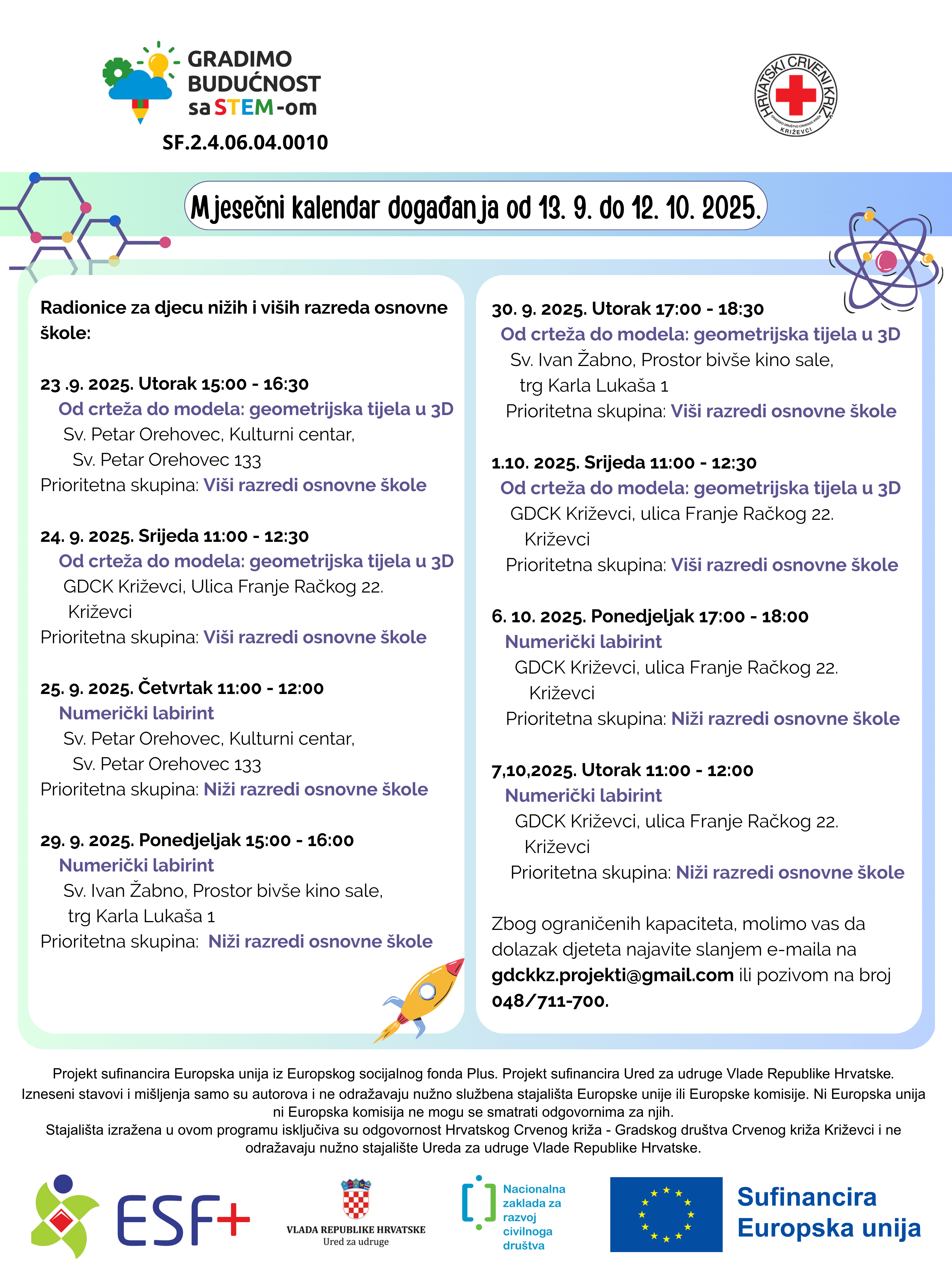 Detaljan kalendar događanja, s lokacijama i terminima radionica, dostupan je i na Facebook profilu Gradskog društva Crvenog križa Križevci.