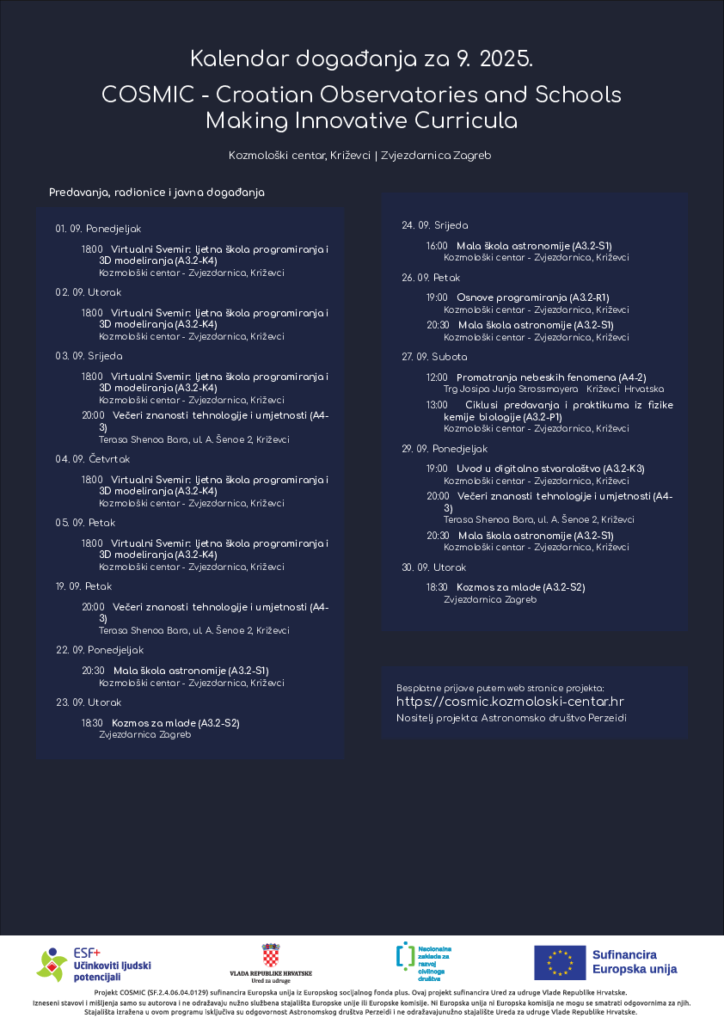 S početkom nove školske godine 2025/26. projekt COSMIC donosi cijeli spektar različitih obrazovnih i znanstveno-popularnih programa u Križevcima i Zagrebu! Od vrlo posjećene Male škole astronomije, preko Osnova programiranja, Uvoda u digitalno stvaralaštvo i promatranja nebeskih fenomena, pa sve do novih programa poput “Kozmosa za mlade” i Istraživanja prirode.