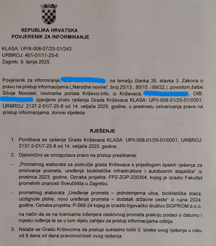 Presudila je to Povjerenica za informiranje Republike Hrvatske, zadužena za zaštitu i promicanje Ustavom Republike Hrvatske zajamčenog prava na pristup informacijama. Nakon naše žalbe, ona je poništila Rješenje koje je donio Grad Križevci, odnosno službenica za informiranje Dijana Marković 14. veljače 2025., kojim su nam odbili dostaviti dva prometna elaborata za koje je postojao izraziti javni interes, plaćeni su javnim novcem, kao i radovi koji su se prema tim elaboratima izvodili.
