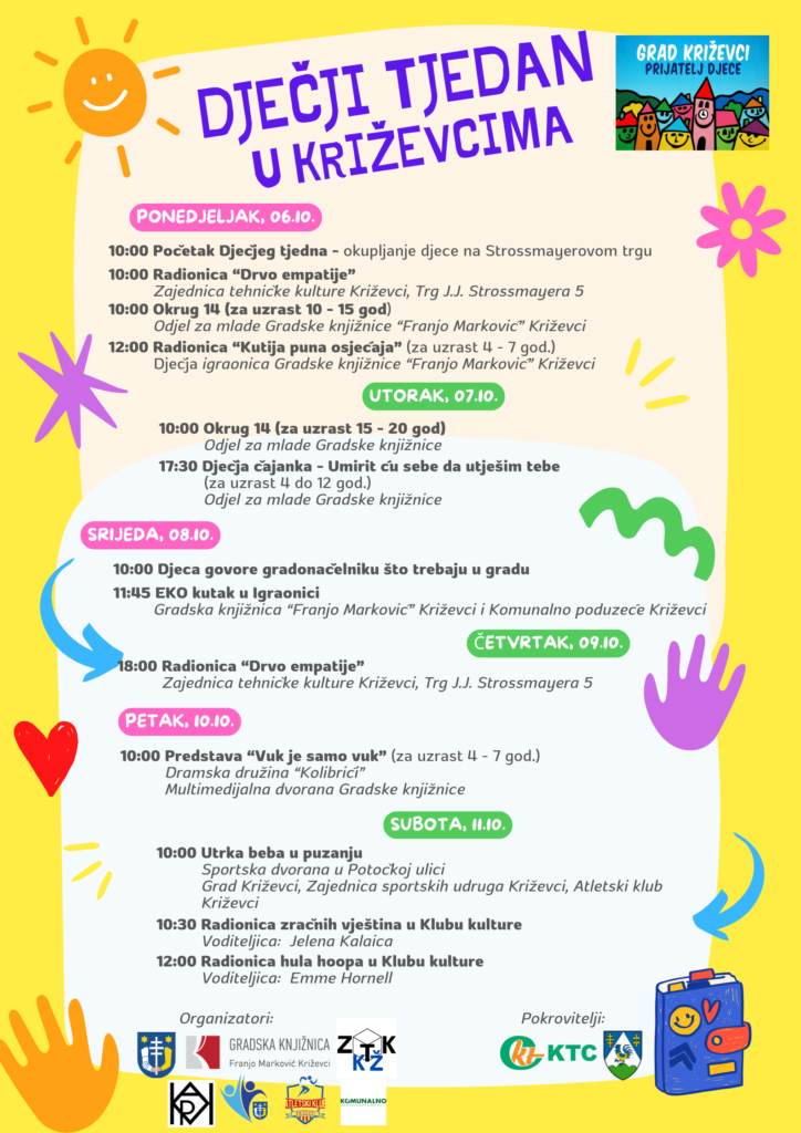 Događanjima za djecu, tematskim radionicama i zabavnim aktivnostima od ponedjeljka 6. do petka 11. listopada obilježit će se Dječji tjedan u Križevcima. Ovogodišnja tema je empatija – ključ međuljudskih odnosa.