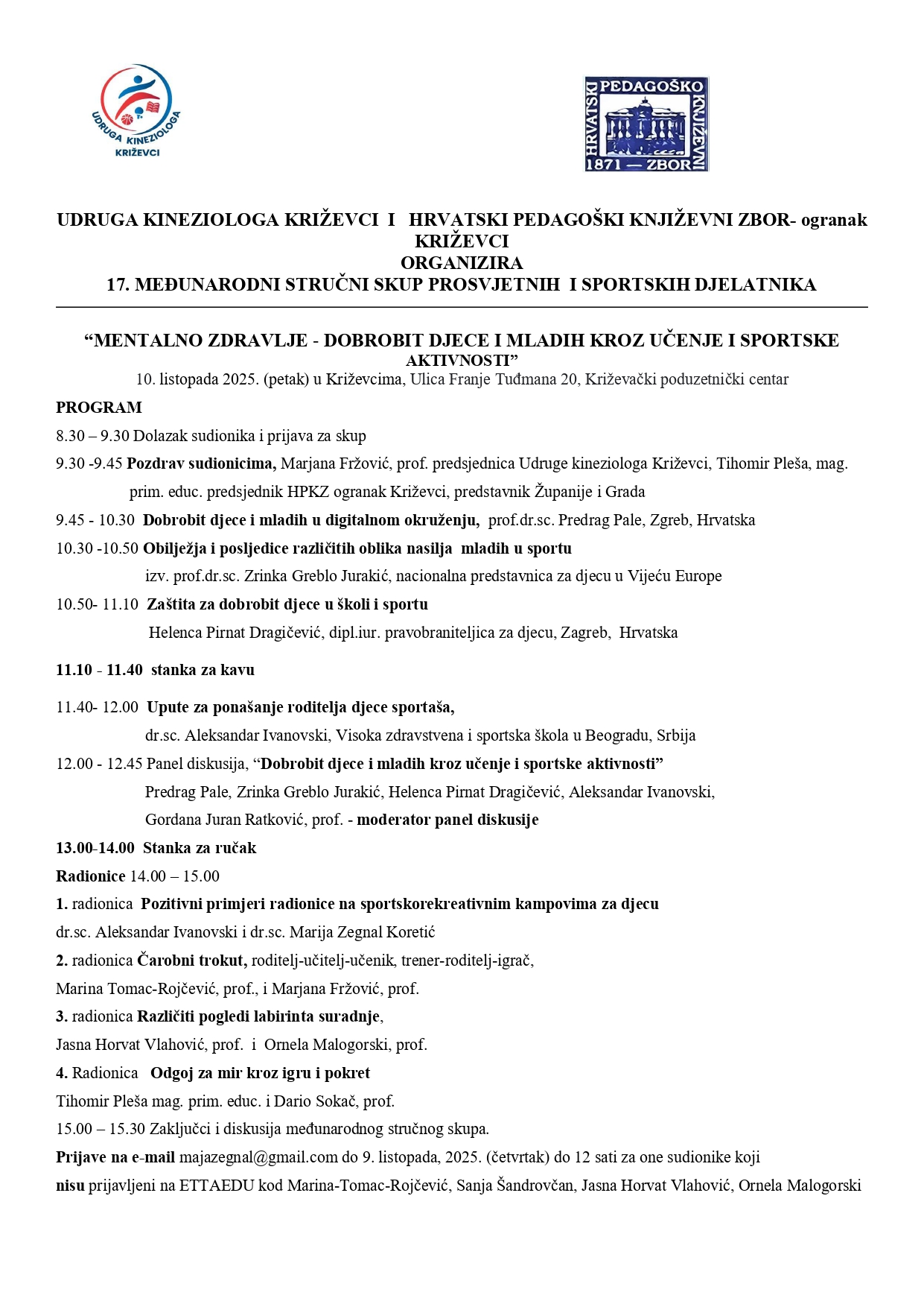 Udruga kineziologa Križevci i Hrvatski pedagoški književni zbor – ogranak Križevci organiziraju 17. međunarodni stručni skup prosvjetnih i sportskih djelatnika “Mentalno zdravlje – dobrobit djece i mladih kroz učenje i sportske aktivnosti”.