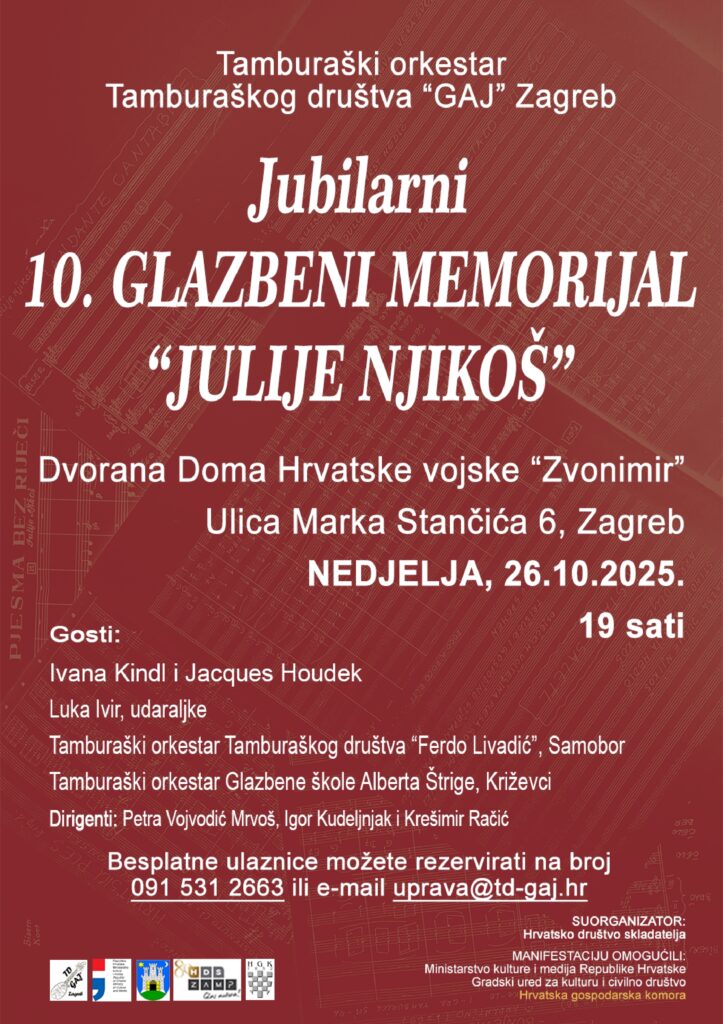 Večeras u 19 sati u u dvorani Doma Hrvatske vojske “Zvonimir”, u Ulici Marka Stančića 6 u Zagrebu, tamburaški orkestar Tamburaškog društva „Gaj“ organizira koncert pod nazivom Jubilarni 10. Glazbeni memorijal „Julije Njikoš“.