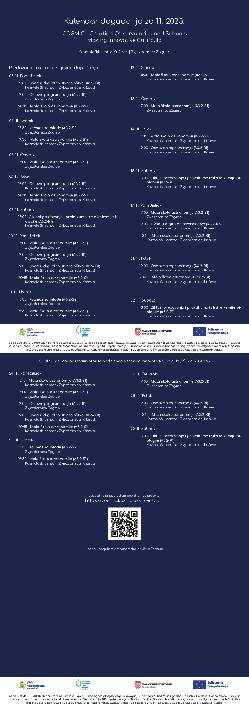 Broj polaznika na radionicama je ograničen, a prijave su otvorene do popunjavanja mjesta. Prijave se zaprimaju redoslijedom pristizanja i obavezne su za sve programe. Prijaviti se možete putem službene stranice projekta: https://cosmic.kozmoloski-centar.hr. Raspored svih predavanja i radionica planiranih za 11. mjesec nalaze se ispod na službenom kalendaru događanja.