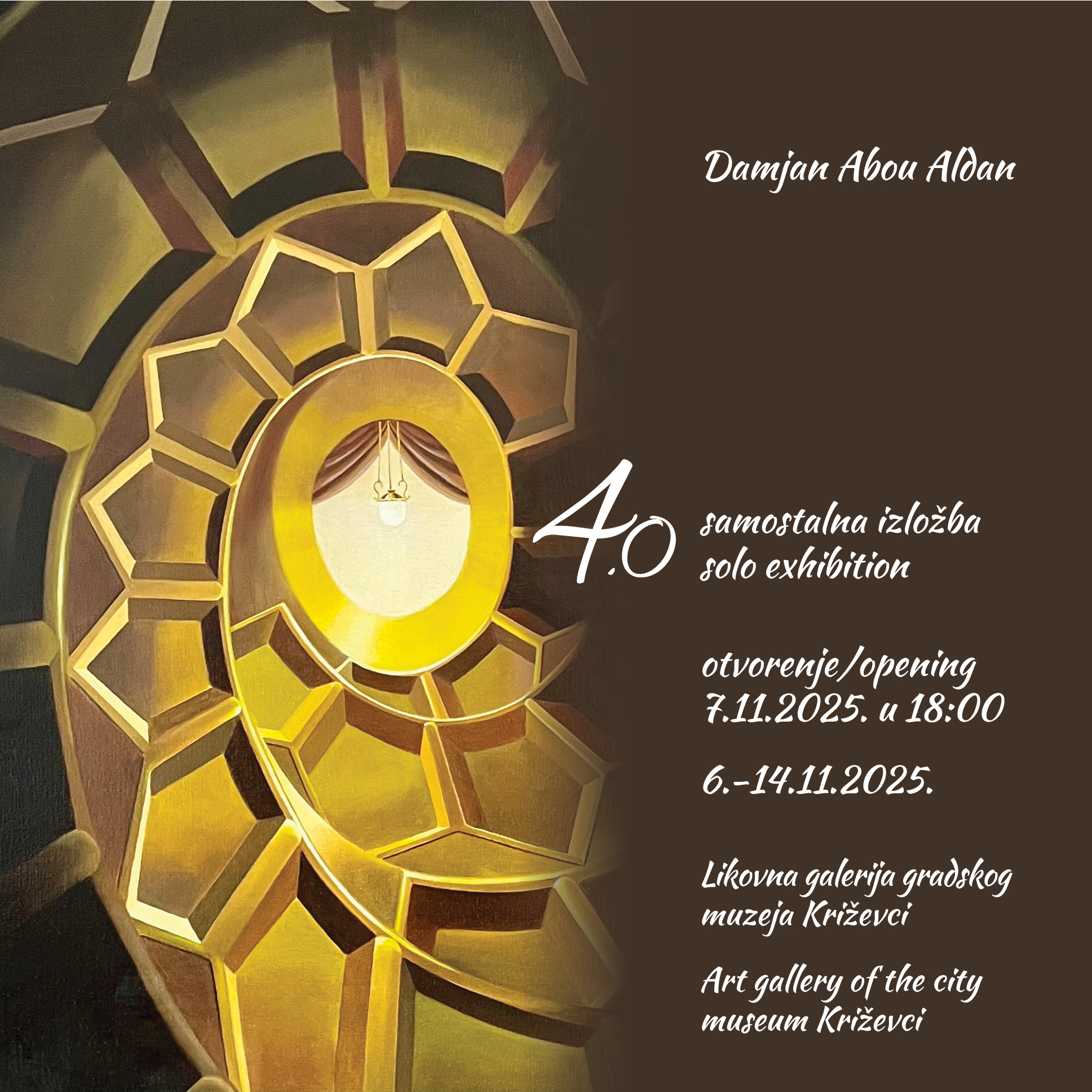 U Likovnoj galeriji Gradskog muzeja Križevci, večeras, 7. studenog, bit će otvorena četvrta samostalna izložba Damjana Abou Aldana. Na izložbi će biti predstavljeno 40 autorskih djela od kojih je 20 ulja na platnu, a 20 su ilustracije, crteži i tematski dizajn. Otvorenje je u 18 sati, a ulazak je slobodan. Izložba će biti postavljena tjedan dana, do 14. studenog.
