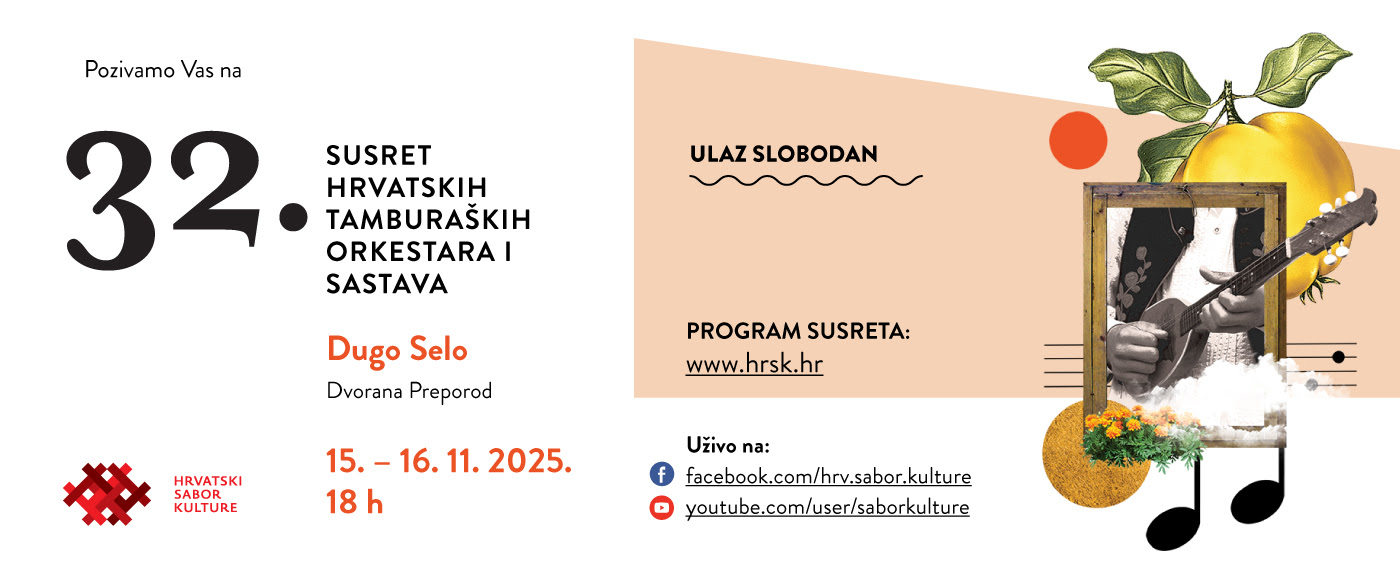 U Dvorani KUD-a Preporod u Dugom Selu, za vikend 15. i 16. studenoga 2025. godine, s početkom u 18 sati, održat će se 32. Susret hrvatskih tamburaških orkestara i sastava – tradicionalna manifestacija koja okuplja najbolje tamburaške orkestre i sastave iz cijele Hrvatske.