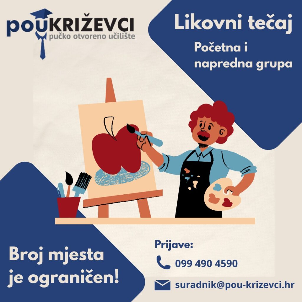 Pučko otvoreno učilište Križevci najavljuje održavanje likovne škole, odnosno tečaja slikarskih tehnika. Upisi na tečaj su u tijeku, za dodatne informacije potrebno je kontaktirati POU Križevci na mail adresu suradnik@pou-krizevci.hr ili broj mobitelja 0994904590.