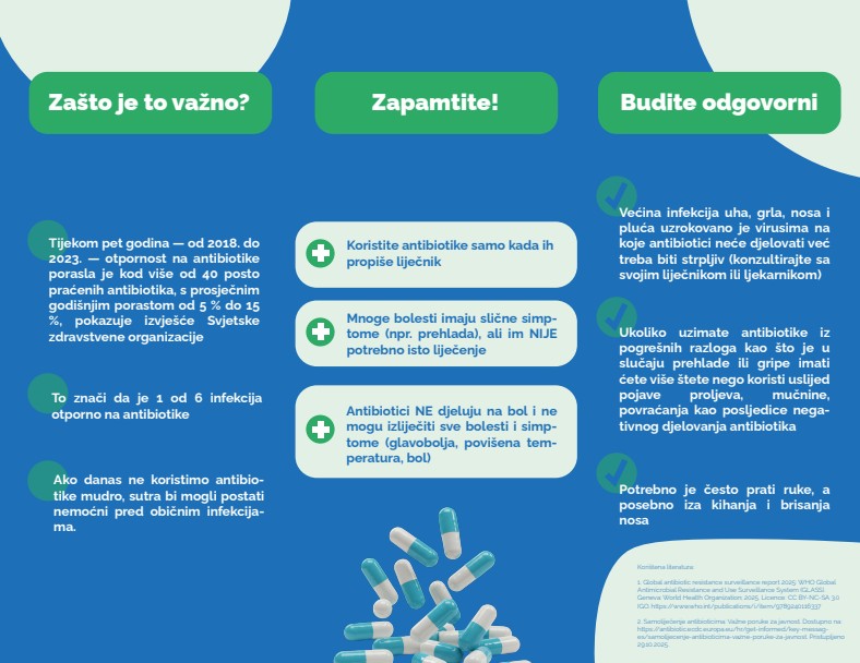 Podsjetimo, antimikrobna rezistencija (AMR) nastaje kada bakterije, virusi, gljivice i paraziti razviju otpornost na lijekove koji se koriste za njihovo liječenje. Najčešće je posljedica neprimjerene ili prekomjerne uporabe antibiotika, ali i nepravilnog zbrinjavanja lijekova i infekcija u zajednici. Prema Europskoj komisiji, AMR je jedna od tri najveće prijetnje javnom zdravlju, odmah iza srčanih i moždanih bolesti. Ona otežava liječenje infekcija, ugrožava kirurške zahvate, liječenje imunokompromitiranih bolesnika, transplantacije i onkološke terapije.