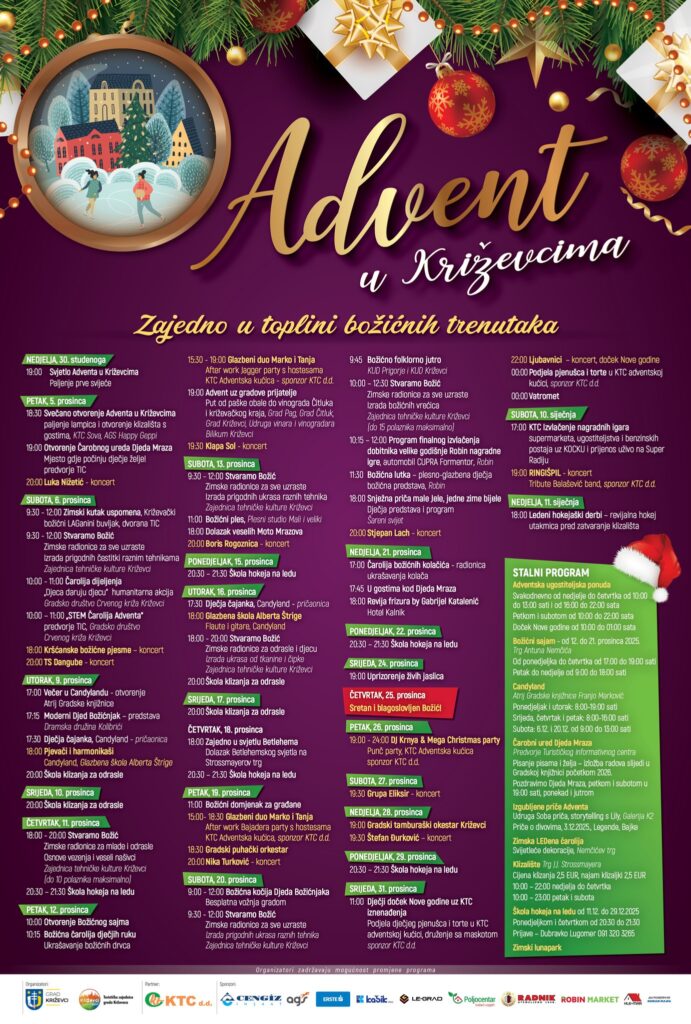 U Maloj dvorani Gradske uprave u Križevcima, predstavljen je program ovogodišnjeg Adventa u Križevcima. Budžet manifestacije bit će na razini prošlogodišnjeg, dok će u samom programu biti nekoliko promjena. Prije svega, veličina klizališta povećana je za 25 posto, s 200 na 250 kvadrata, adventske kućice neće biti na prošlogodišnjoj lokaciji već na prostoru iznad stepenica, pored paviljona, također na Strossmayerovom trgu. Ove godine imat ćemo i više koncerata, a za dosta događanja zaslužna je tvrtka KTC d.d., partner Adventa.
