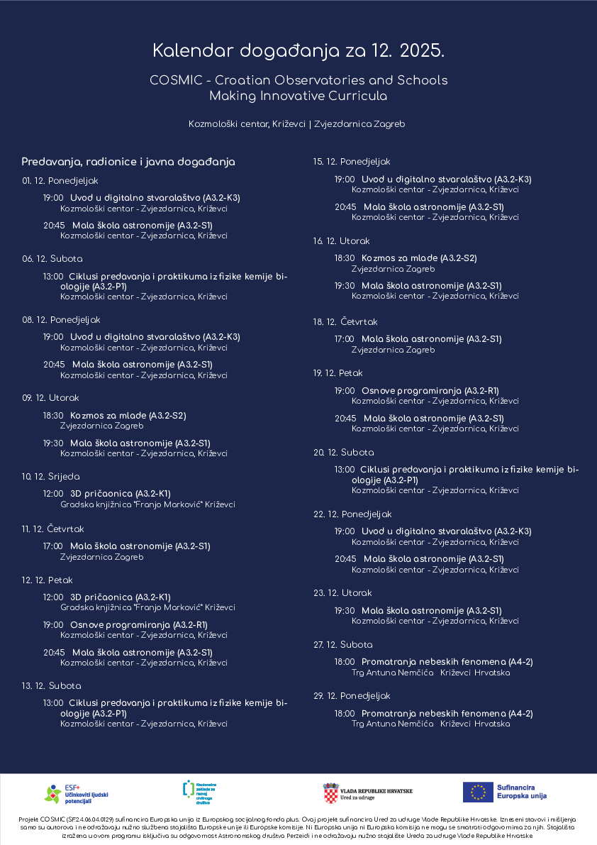 Novi mjesec donosi nam i nove aktivnosti projekta COSMIC – Astronomsko društvo Perzeidi i partneri objavili su pregled svih aktivnosti koje se tijekom prosinca održavaju u sklopu projekta. Mjesec je ispunjen edukativnim programima za djecu i učenike u Zagrebu i Križevcima, od astronomije i programiranja do biologije, filozofije i 3D stvaralaštva.