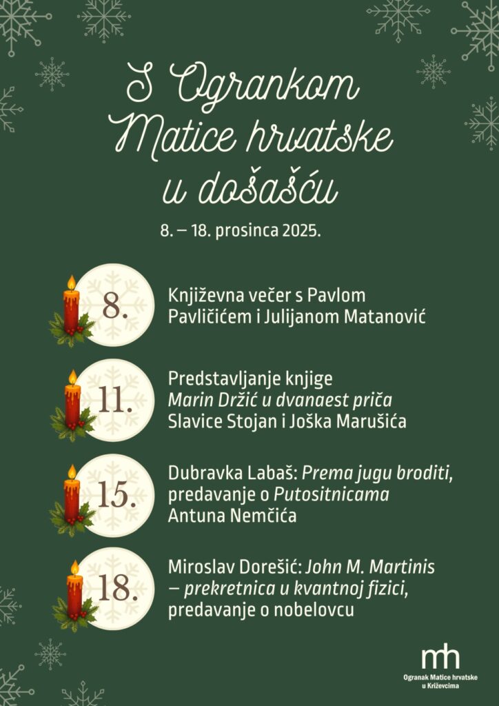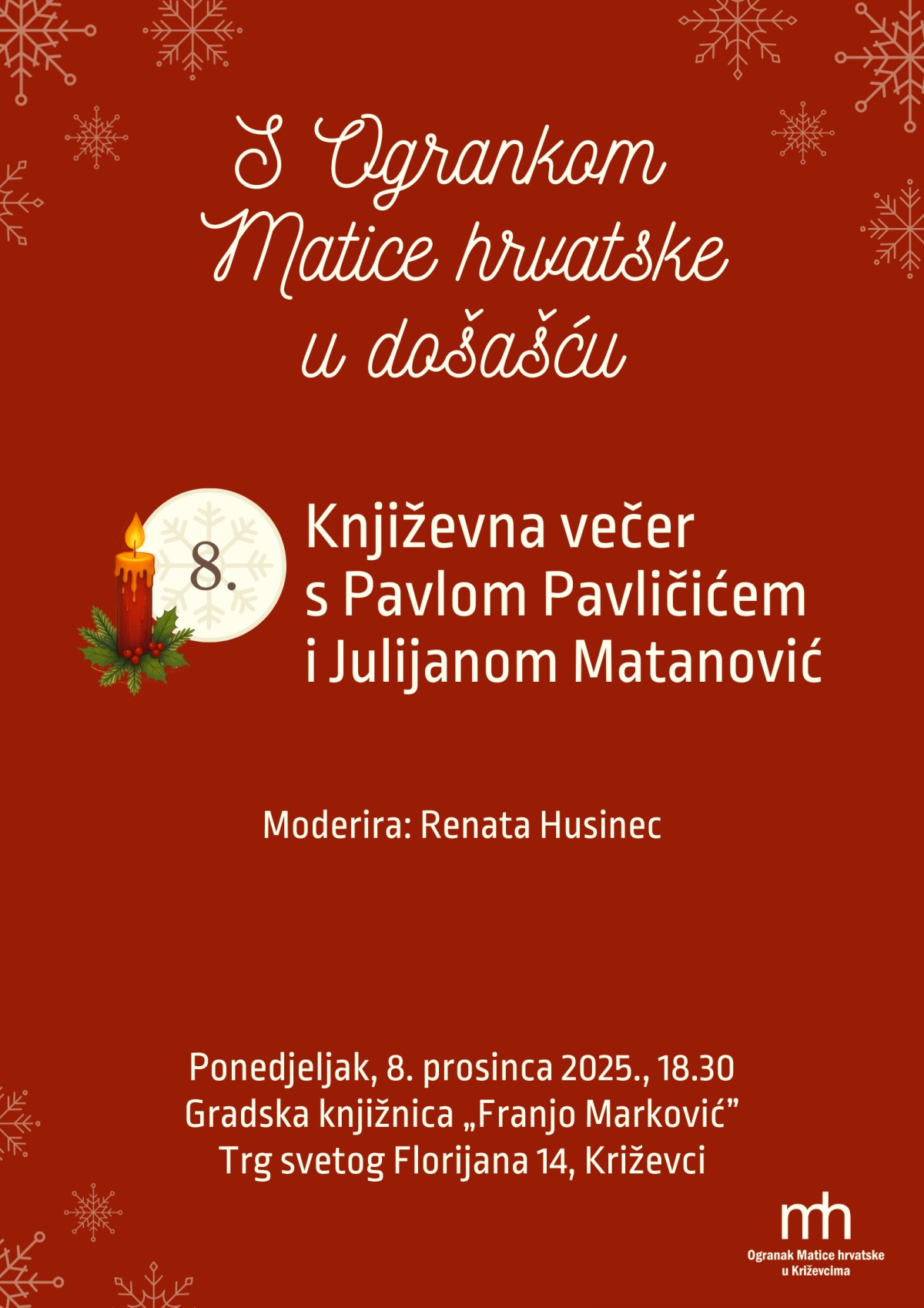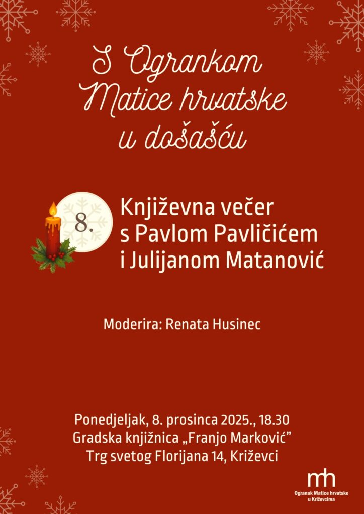 Ogranak Matice hrvatske u Križevcima i Gradska knjižnica “Franjo Marković” Križevci organiziraju književnu večer s gostima književnicima Julijanom Matanović i Pavlom Pavličićem. Književna večer će se održati u ponedjeljak, 8. prosinca 2025. u 18:30 sati u Gradskoj knjižnici, a ulazak je slobodan.