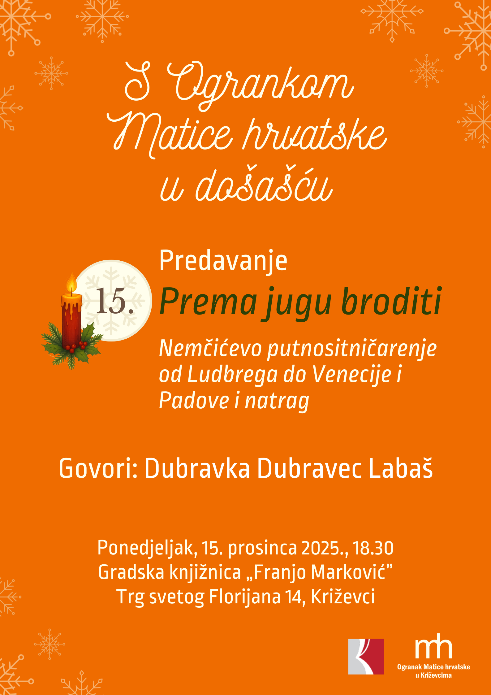 Ogranak Matice hrvatske u Križevcima i Gradska knjižnica “Franjo Marković” Križevci pozivaju na predavanje “Prema jugu broditi: Nemčićevo putositničarenje od Ludbrega do Venecije i Padove i natrag”, koje će održati dr.sc. Dubravka Dubravec Labaš, viša lektorica na Odsjeku za talijanistiku Filozofskog fakutleta Sveučilišta u Zagrebu.