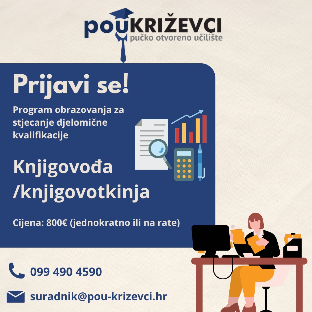U Pučkom otvorenom učilištu Križevci do 16. siječnja otvorene su prijave za program obrazovanja za stjecanje djelomične kvalifikacije Knjigovođa/knjigovotkinja. Tijekom programa polaznici će steći temeljna i napredna znanja iz računovodstva i knjigovodstva, uz praktičan rad u aplikacijskom softveru Synesis. Naučit će voditi poslovne knjige, evidentirati imovinu, račune i poslovne promjene, obračunavati PDV, plaće i naknade, te usvojiti mnoga druga znanja i vještine.